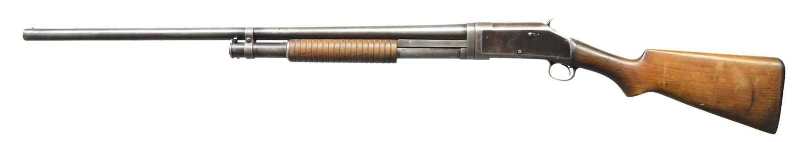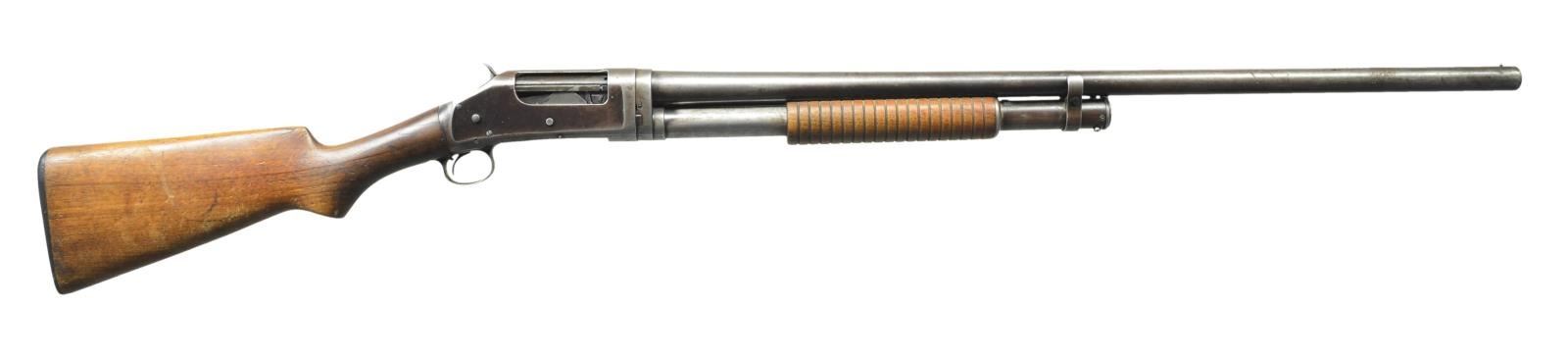 Cal. 12 Ga. S# E799499 (1929). Plain 30" bbl. w/ front bead & marked "FULL" choke. Tubular mag. Walnut forearm & pistol grip stock w/ Winchester buttplate. CONDITION: fair overall w/ moderate handling marks. Blue fading to gray/brown patina w/ areas of pitting. Worn wood finish w/ several cracks. Well worn buttplate. Good bore w/ fouling. (21-4373/MD). CURIO. $250-350.