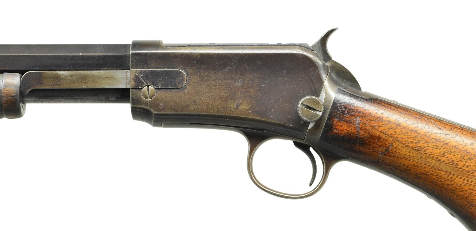 Cal. 22 WRF. S# 277383. BBL. 24" octagon. Model 1890 sporting sights. Very late 2nd model with mortised breech block. Scarce & desirable uncheckered pistol grip walnut stock has small hard rubber grip cap and crescent steel buttplate. Serial number indicates 1906 as an approx. date of mfg. CONDITION: Original blue shows light wear with fading to brown showing small scratches & dings. Wood shows wear & handling marks with a hairline crack left of top tang. Bore retains sound rifling showing very light pitting. (22-1863/DS). CURIO. $2500-4000.