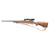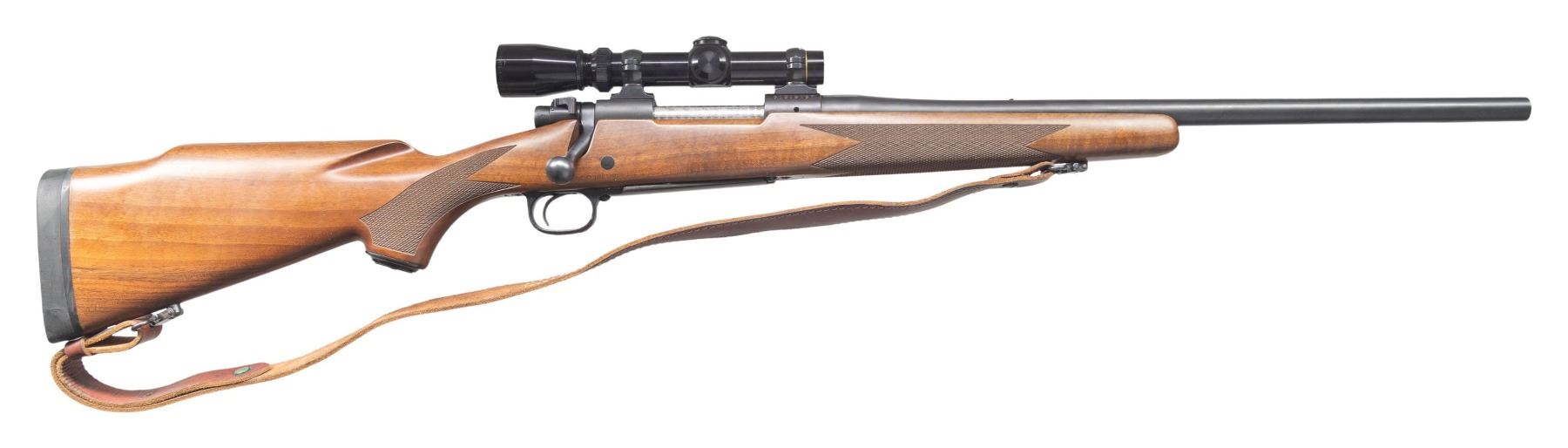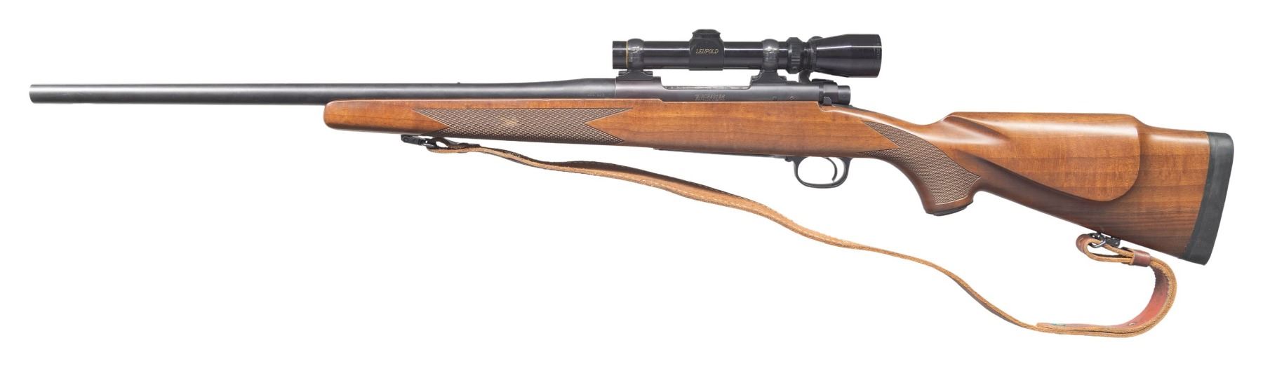 RIFLE. Cal. 425 Exp. S# G1319167. Unmarked custom heavyweight barrel measuring 21" in length measuring 3/4 of an inch in diameter at the muzzle has a recessed muzzle face. Leopold Vari-XII, I-4X gloss finished scope with dot reticle on two piece bases. Push feed action with jeweled bolt body. Steel floorplate with alloy trigger guard. Monte Carlo cheekpiece sporter stock with cut checkering. Beavertail leather sling on QD swivels. LOP: altered to 13 7/8" over a solid black Decelerator pad. CONDITION: barrel and action retain very good matte style reblued finish. Stock has original finish showing scattered scratches and marks. Very good bright bore. Scope has clear optics. PROVENANCE: From the Buckstix Collection. (25-6411/DS). MODERN. $2,000-3,000.