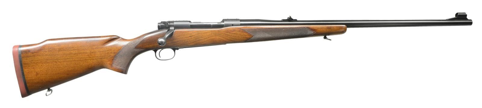 RIFLE. Cal. 375 H&H Mag. S# 476099. Bbl. 25" w/ hooded ramp bead front sight & dual folding leaf rear sight. Bolt is numbered to rifle. Monte Carlo walnut stock w/ hand checkering, sling swivels & original solid red pad. 1960 Mfg. CONDITION: near new, retaining 99% wood & metal finish. Bright, near excellent bore. (22-187/DS). CURIO. $3,250-4,000.