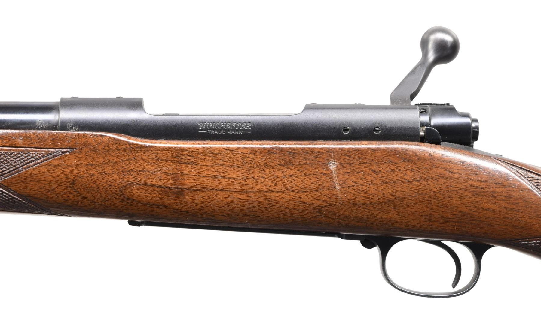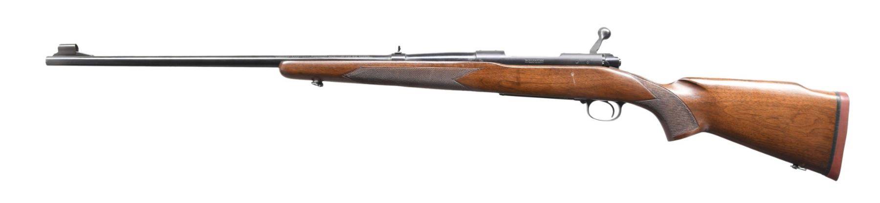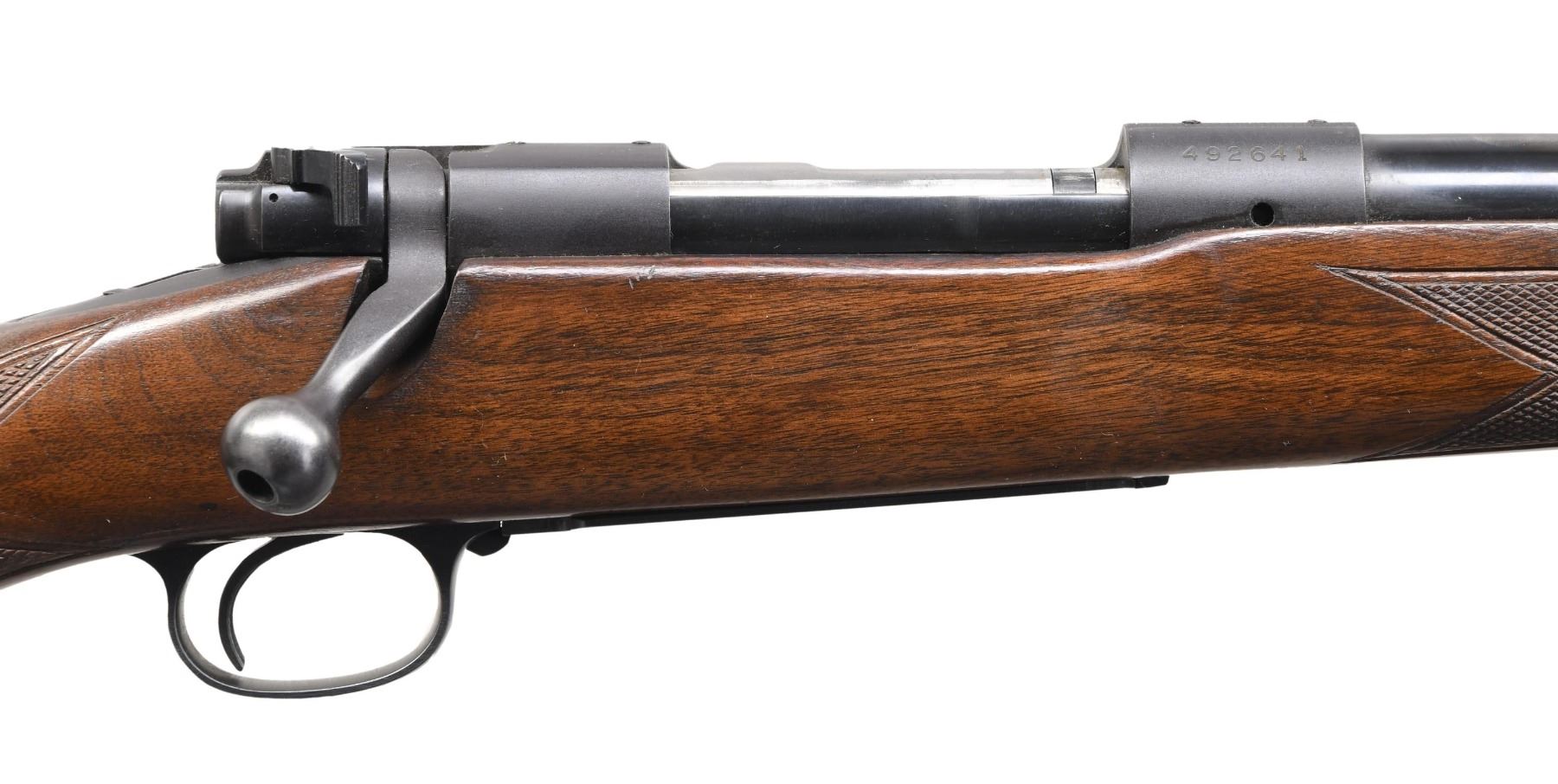 RIFLE. Cal. 338 Win Mag. S#. 491641. Bbl. 25" w/ hoode ramp bead front & folding leaf rear sight. Action features claw extractor, 3 position safety & hinged floorplate. Bolt body is numbered to the rifle. Monte Carlo walnut stock has hand checkering, sling swivels & original solid red Winchester pad. Mfg. 1960. CONDITION. over 98% original blue. Original stock finish shows a few handling marks. Bright near excellent bore. (24-5765/DS). curio. $1800-2500.