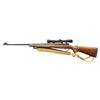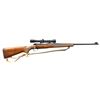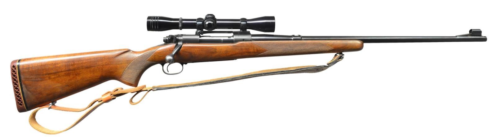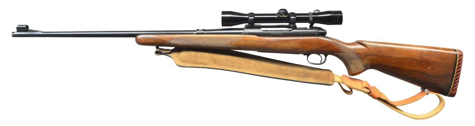 Cal. 270 Win. S# 134522. Bbl. 24" standard weight. Hooded ramp bead front sight, rear sight is removed. Redfield 4x Widefield gloss finished scope w/ duplex reticle on Redfield mts. Bolt body is numbered to rifle. Straight comb checkered walnut stock. Leather beavertail sling on original swivels. LOP: trimmed to 14 3/8" over aftermarket red ventilated pad marked "YOUNG'S SPTG GDS". Mfg. 1950. CONDITION: over 90% original blue showing light muzzle & carry wear. Stock has added finish over wear & handling marks w/ gouges from buttplate installation. Bore retains sound rifling. Scope has clear optics. (21-4350/DS). CURIO. $750-1,000.
