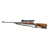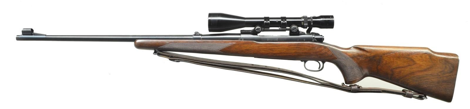 Cal. 30-06. S# 212828. Bbl. 24" standard weight. Hooded ramp bead front sight with folding leaf rear sight. Bausch & Lomb 2.5-8x40 matte finished scope with external adjustments & standard crosshair. Action features claw extractor, 3 position safety & hinged floorplate. Bolt is numbered to rifle. Monte Carlo walnut stock with factory checkering & checkered steel buttplate. Boyt leather sling on original swivels. Mfg. 1952. CONDITION: over 97% original finish showing carry wear on bottom metal. Original stock finish shows a few small marks. Bright bore with sharp rifling. Scope has bright optics. (22-5207/DS). CURIO. $800-1,200.