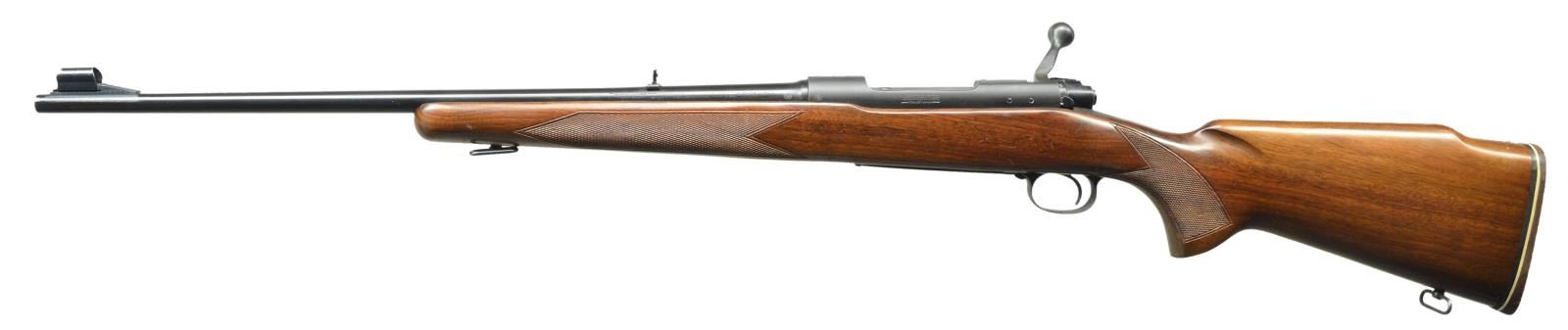 ACTION RIFLE. Cal. 30-06. S# 345757. Bbl. 22" tapered light weight. Hooded ramp bead front sight w/ folding leaf rear sight. Bolt is numbered to rifle. Alloy floorplate & trigger guard. Monte Carlo stock of checkered walnut w/ original sling swivels. LOP: shortened to 13 1/2" over an aftermarket Pachmayr solid brown rifle pad. Mfg. 1955. CONDITION: bbl. & receiver retain 98% original blue. Floorplate has gray faded appearance. Original stock finish shows scattered scratches & marks w/ a heavier dent in left side forearm checkering. Near excellent bore. (21-4345/DS). CURIO. $800-1,200.