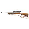 ACTION RIFLE. Cal. 243 Win. S# 347627. Bbl. 22" light sporter weight. Hooded ramp bead front sight with folding leaf rear sight. Leupold Vari-X II 3-9X40 gloss finished scope with duplex reticle on Leupold 1 piece mount. Action features claw extractor, 3 position safety and aluminum bottom metal with hinged floorplate. Bolt is serial numbered to rifle. Monte Carlo walnut stock with hand checkering and aluminum buttplate having a Cabelas military style leather sling on original swivels. Mfg. 1955. CONDITION: over 97% original metal finish. Good original stock finish showing scattered marks and wear spots with series of small dents right of rear receiver ring. Bright near excellent bore. (22-5273/DS). CURIO. $1,000-1,400.