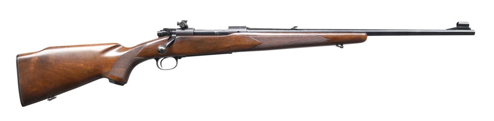 ACTION RIFLE. Cal. 30-06. S# 476286. Bbl. 22" lightweight tapered round. Hooded ramp bead front sight, folding leaf rear sight, and Lyman 48WJS receiver sight. Action features a claw extractor and 3-piece safety. Hinged floorplate. Monte Carlo walnut stock with hand checkering, swivel bases, and original plastic buttplate. Pistol grip has an added steel grip cap with a red W insert. Mfg. 1960. CONDITION: 97% original blue, showing edge wear. Stock has a good original finish with a few light scratches & marks. Bright, near-excellent bore. PROVENANCE: From the Working Reference Collection of Military Arms Instructor, Master Sergeant Vincent Pestilli. (23-7478/DS). CURIO. $1,000-1,500.