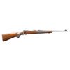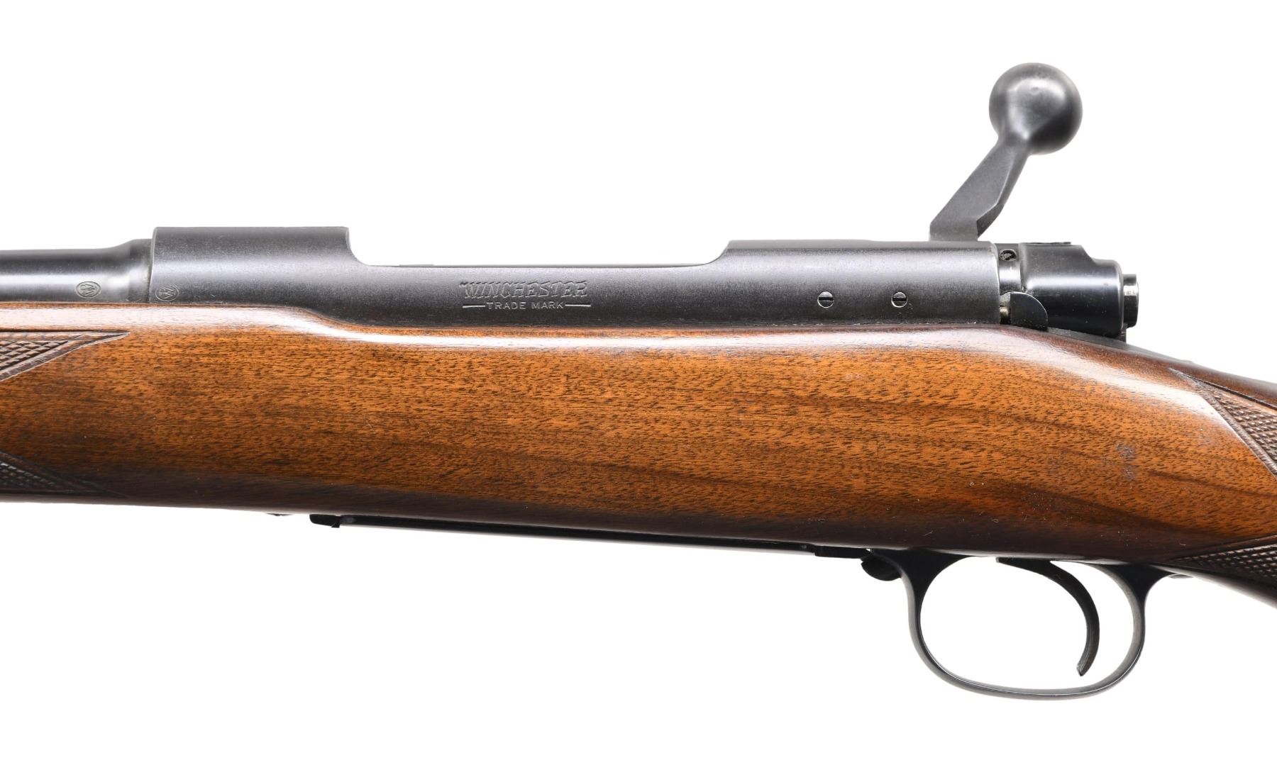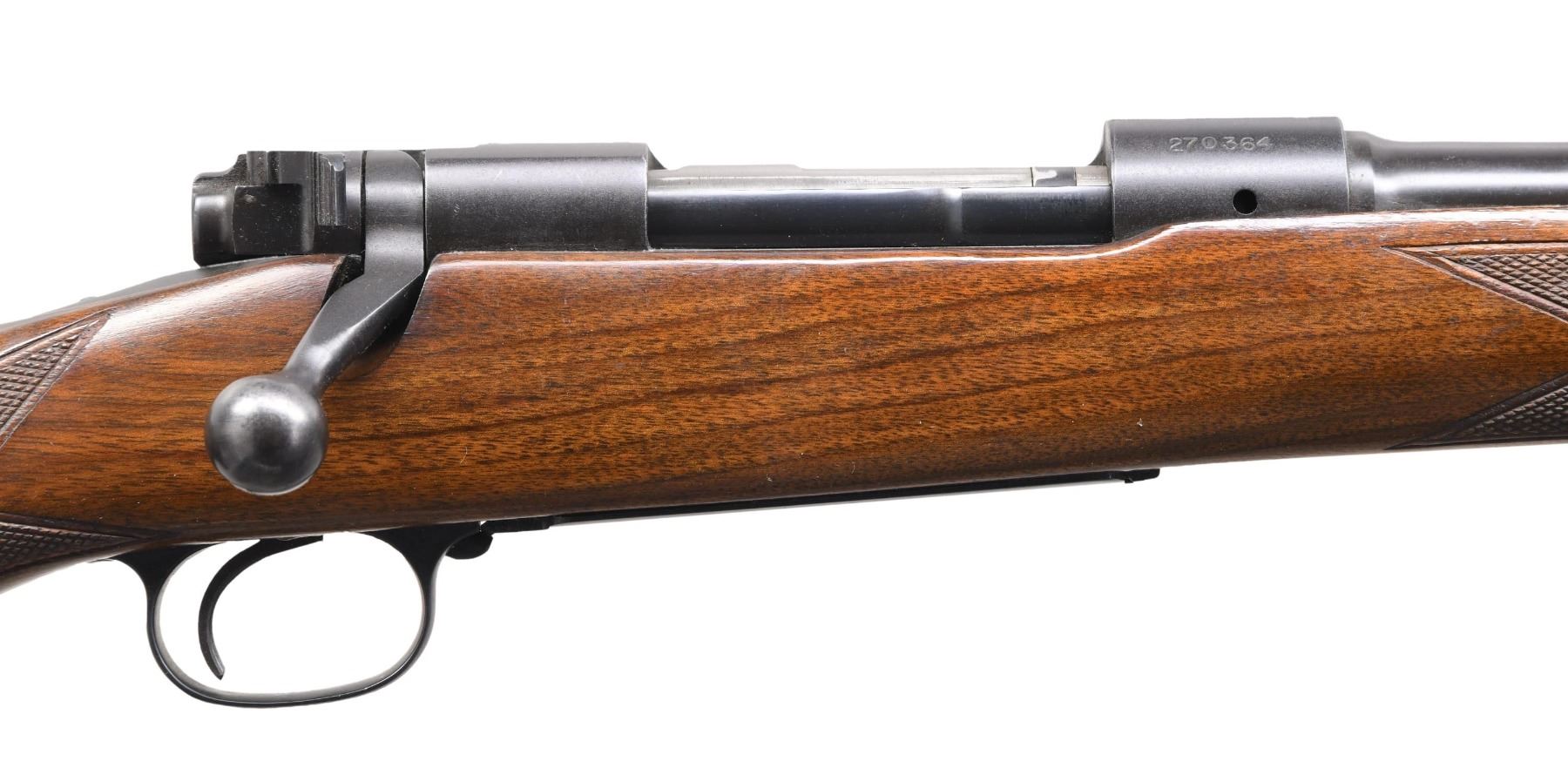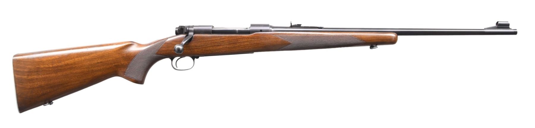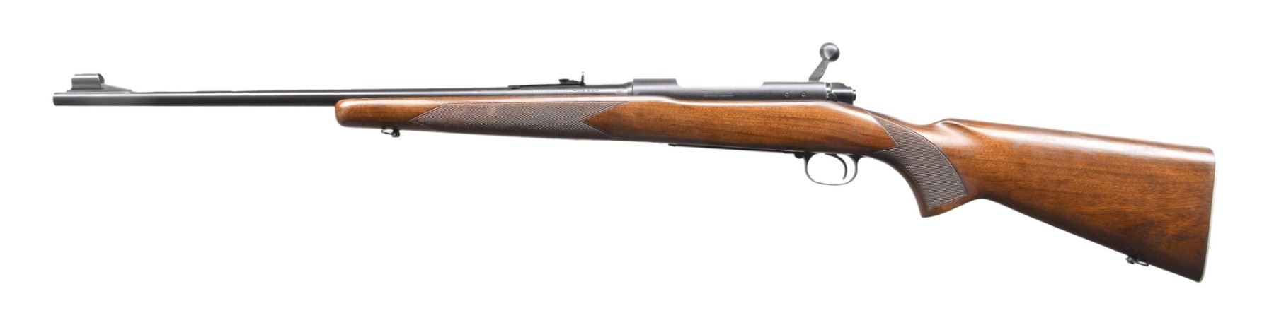 ACTION RIFLE. Cal. 308 Win. S# 270364. Bbl. 22" light taper. Hooded ramp bead front w/ elevator adj. sporting rear sight. Action features cclaw extractor, 3 position safety & hinged floorplate. Bolt body is numbered to the rifle. Staight comb stock has hand checkering , sling swivels, & checkered aluminum buttplate. mfg. 1953. CONDITION: over 97% blue. Very good original stock finish shows small marks. Near excellent bore. (24-5761/DS). CURIO. $1200-1600.