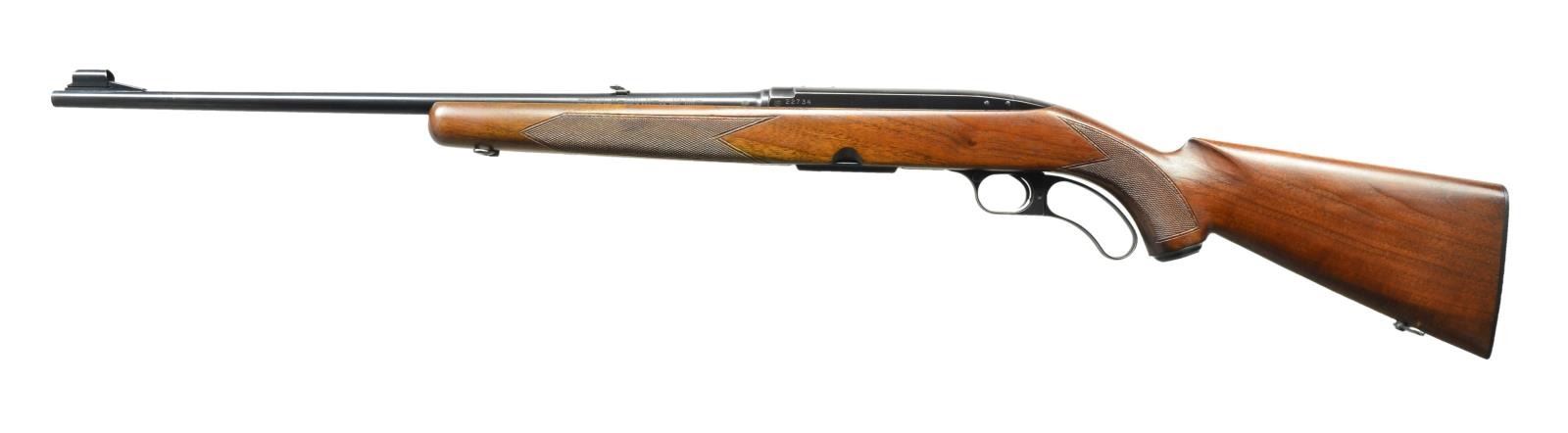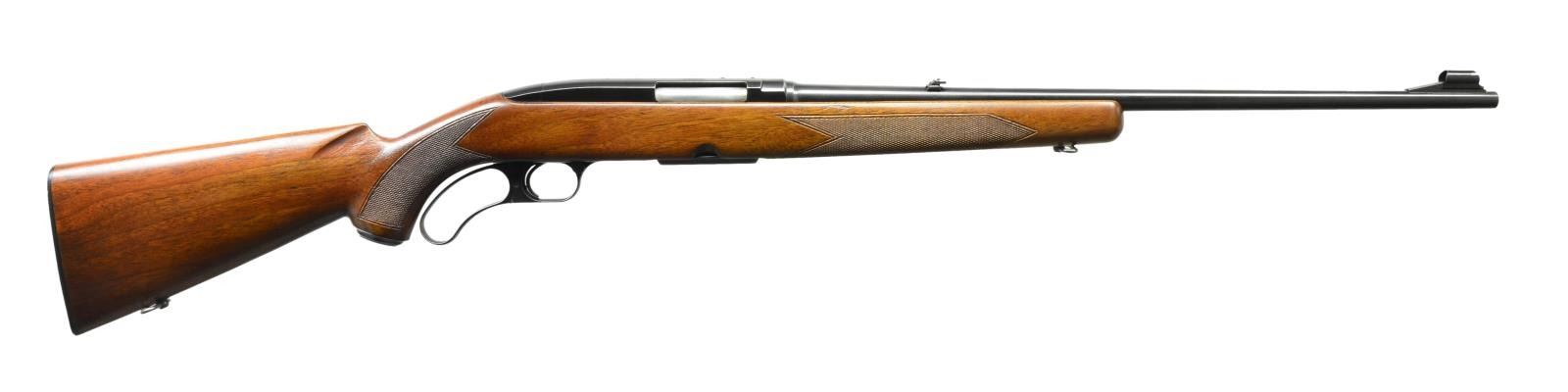 Cal. 308 Win. S# 22734. Bbl. 22". Hooded ramp bead front sight & folding leaf rear sight. Walnut stock w/ hand checkering, swivel bases, red "W" steel grip cap & plastic buttplate. 1956 Mfg. MAGS: 1 detachable 4 rd. CONDITION: 75% lightly worn blue showing edge & carry wear w/ finish loss from scope base. Stock has good refinish w/ lightly worn checkering. Bore has sound rifling showing sm. spots of pitting near muzzle. (21-3652/DS). CURIO. $500-800.