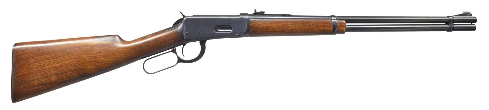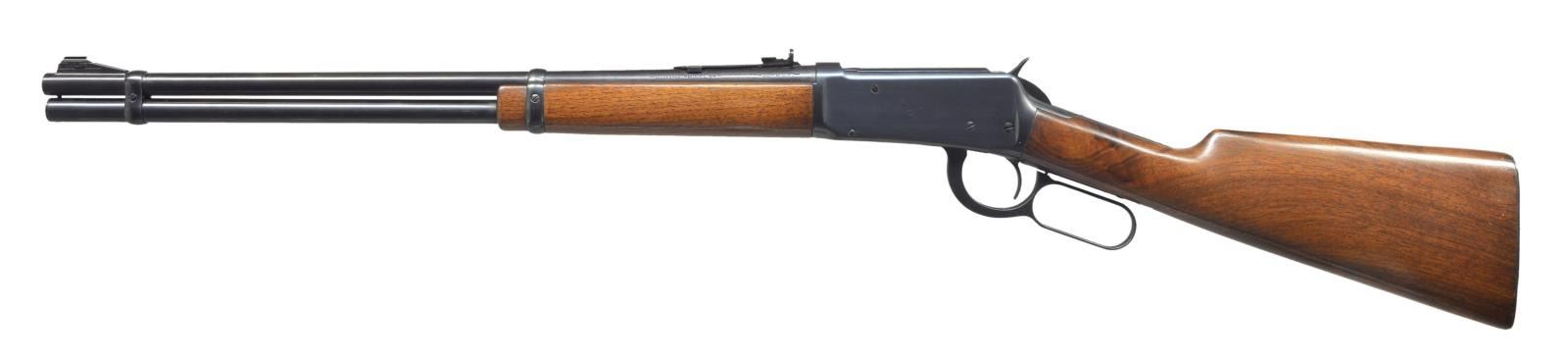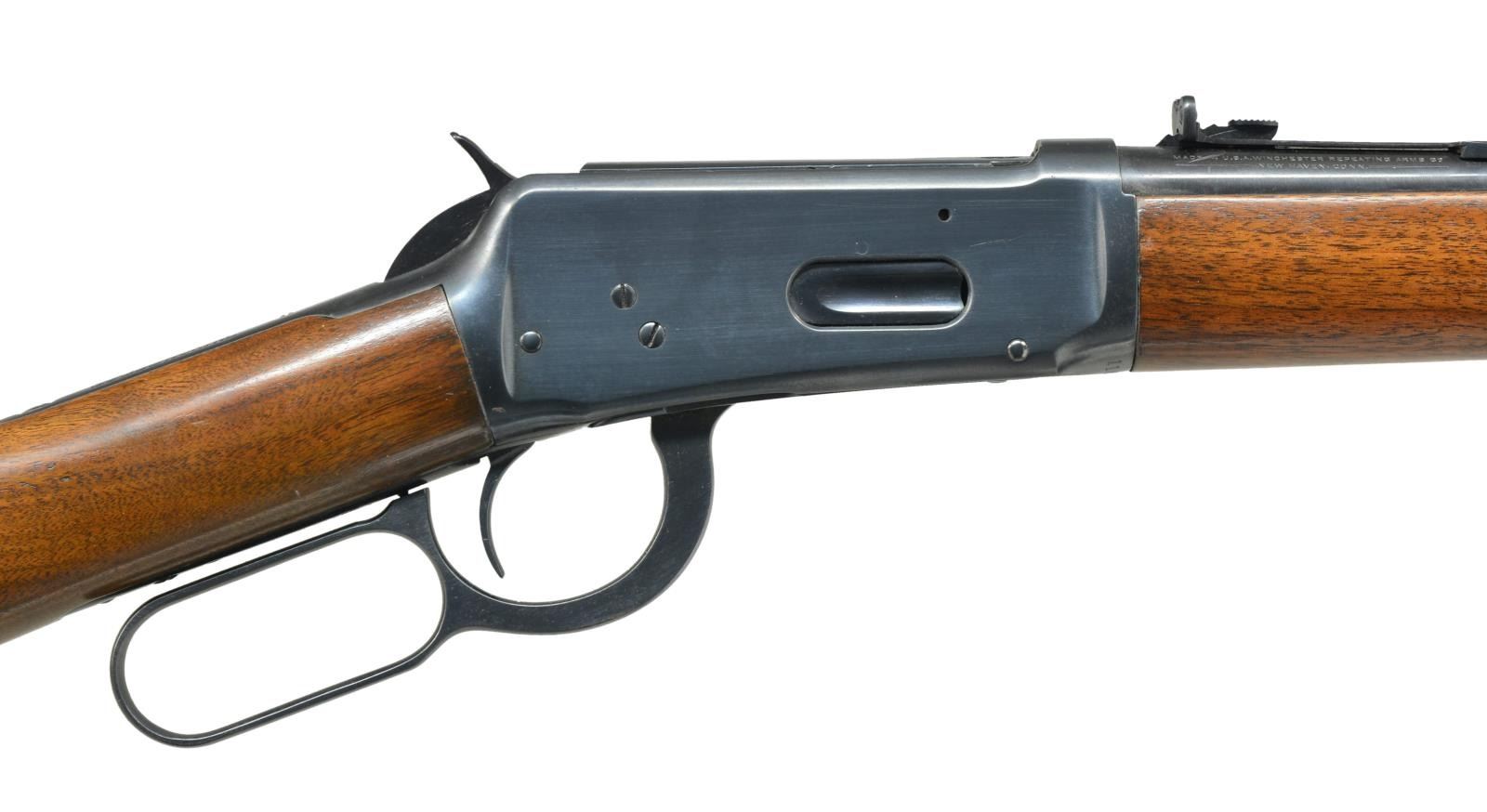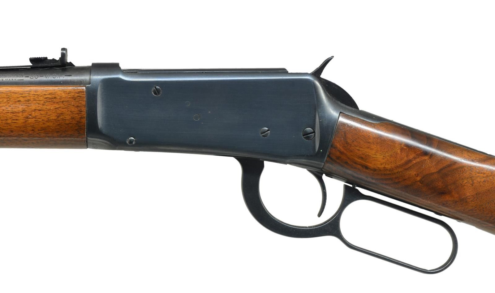 Cal. 30 WCF. S# 1167863. Bbl. 20" w/ ramp mounted bead front sight & elevator adj. rear sight. Full length mag. Post war style short wood forearm. Pre War straight grip walnut stock w/ grooved steel buttplate. 1941 Mfg. CONDITION: over 98% reblued finish. Stock & forearm have good refinish. Stock has sm. added wood repair right side of comb near the peak. Bore is bright w/ strong rifling showing sm. spots of pitting near muzzle. (21-2517/DS). CURIO. $350-500.