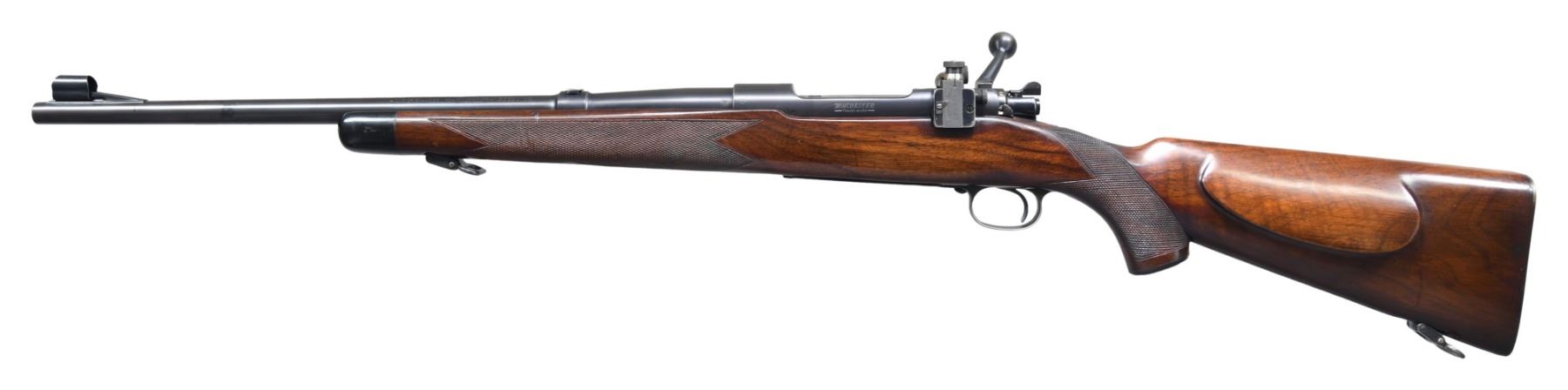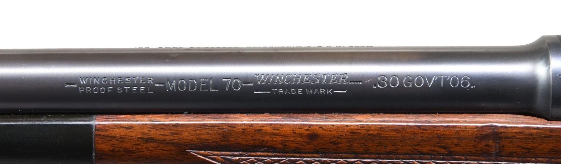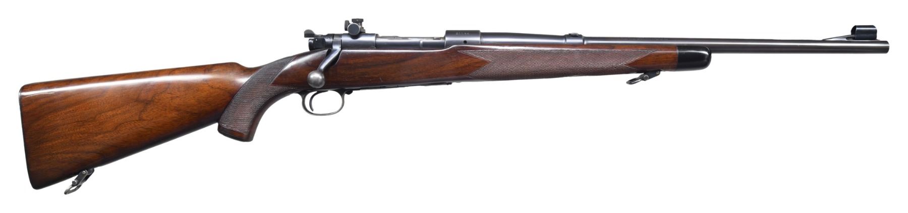 ACTION CARBINE. Cal. .30 GOV'T'06. (30-06). S# 21164. Bbl. 20" carbine length of Winchester proof steel. Hooded bead front sight on a stippled ramp, filler in rear sight cut w/ a Lyman 48 WJS receiver sight. Bottom of bbl. is marked "1906, 38" indicating 30-06 cal. & 1938 manufacture. Type 1 pre-war action w/ cloverleaf tang. The bolt has pre-war style safety & is properly numbered on the bottom. Extractor, magazine box, follower, ejector, bolt release & trigger guard are proper. The floorplate is stamped "SUPER GRADE". Supergrade style stock of nicely figured walnut. Features include straight comb, small oval cheekpiece, checkered steel buttplate, hard rubber grip cap, Super Grade style sling swivels, black forearm tip & Super Grade style checkering. CONDITION: bbl. & action retain 90% lightly worn blue showing light muzzle & edge wear. Lyman rear sight shows edge wear w/ spots of corrosion on polished parts. The stock has added finish over small dents, handling marks & wear spots. Very good bright bore. PROVENANCE: Estate of Russell Dickerman. (25-1937/DS). CURIO. $4,000-6,000.