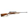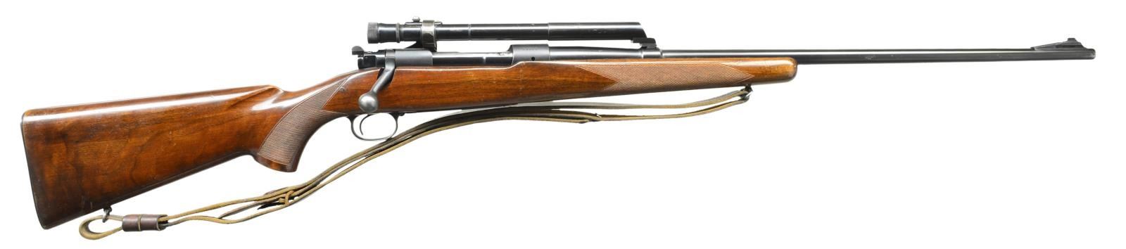 RIFLE. Cal. 300 Magnum (300 H&H Mag.). S# 44942. Bbl. 26" w/ ramp mounted bead front sight. Early Weaver 330 3/4" tube scope w/ post reticle held in M.L. Stith mts. using the rear sight dovetail & factory receiver sight mounting holes. Action has Pre War features including first style safety & cloverleaf tang. Bolt body numbered to rifle. Straight comb checkered walnut stock w/ checkered steel buttplate having original style military sling & swivels. Mfg. 1942. CONDITION: over 90% original blue showing light muzzle & bottom metal wear w/ scattered scratches on bbl. Original stock finish shows areas of wear w/ numerous scratches & handling marks. Left side of stock is notched for receiver sight clearance. Bright bore w/ sharp rifling. (21-4156/DS). CURIO. $1,750-2,500.