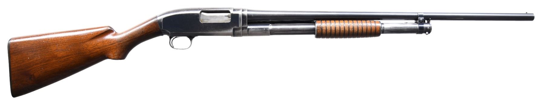 SHOTGUN. Cal. 20 ga. S# 40. Very early first year production shotgun. Bbl. 25" of Nickel Steel w/ fixed full choke. Brass front bead. Small round grooved forearm & early style pistol grip stock w/ original buttplate. CONDITION: all original shotgun. Over 70% lightly faded original blue showing slide & carry wear w/ light scratches & small marks. Original wood finish shows areas of wear w/ scattered scratches & marks. Stock has a hairline crack & chip around trigger guard tang. Sound action. Very good bright bore. PROVENANCE: The estate collection of Don "Duck" Combs. (24-2510/DS). CURIO. $1,500-2,000.