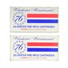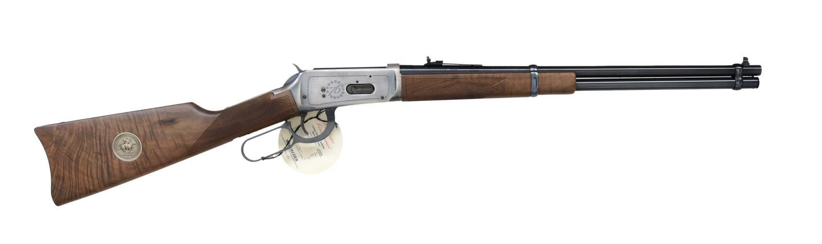 LEVER ACTION CARBINE. Cal. 30-30 Win. S# USA 79. Bbl 20” with dovetailed post style front sight and elevator adjustable rear. Mfg. 1976 in celebration of America’s Bicentennial year; 19,999 units. Attractive silver finished receiver having engraved borders with eagle on left plus “76” and 13 stars on right. Saddle ring carbine configured with saddle ring on left plus early carbine style curved metal buttplate. Nicely grained walnut stock set with cut checkering and long wood forend; silver finished Bicentennial medallion in right side of buttstock. UNATTACHED ACCESSORIES: near excellent original box with decorative sleeve plus 1976 Winchester catalogue and hang tag. 2 boxes (20 rds. each) of Winchester Bicentennial marked ammo; nickel plated cases. CONDITION: small chip on left side of buttstock adjacent to carbine buttplate that has two very small spots of oxidation; all other aspects near excellent appearing new and unfired. (24-2148/NW). MODERN. $1,000-1,500.