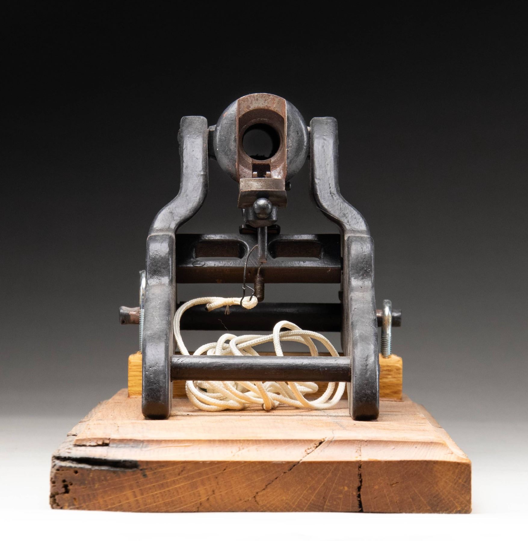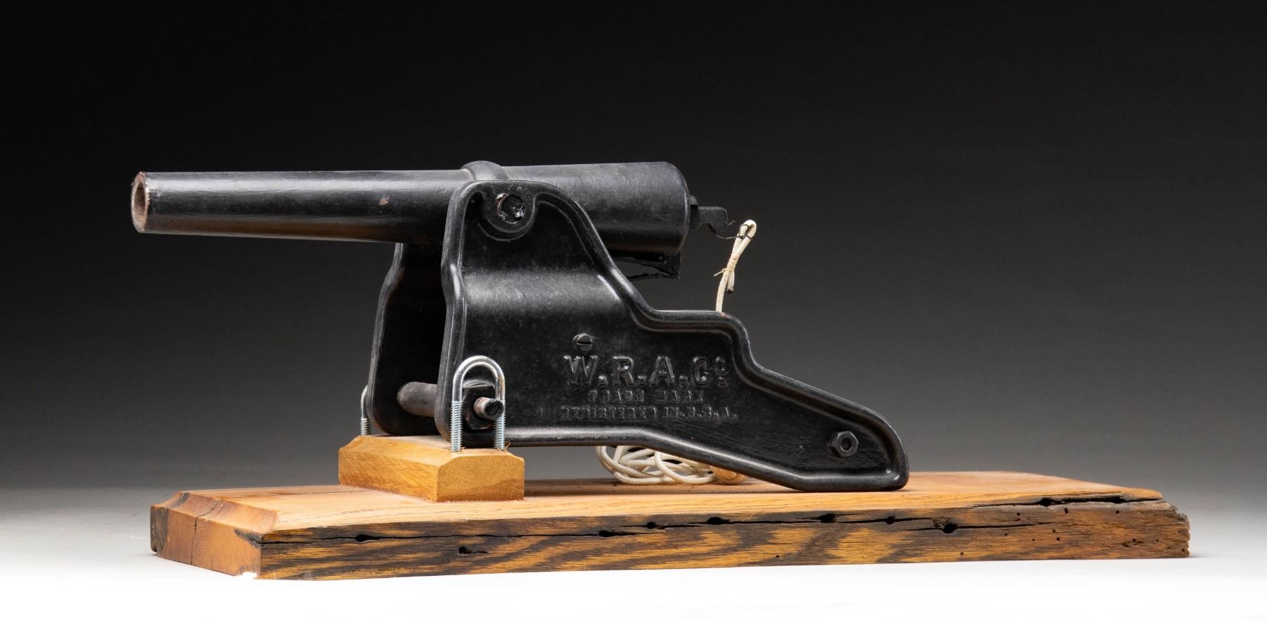 Cal. 10 Ga. Blanks. NSN. Mfg. 1908-1958. Bbl. 12" w/ 1 1/4" diameter at muzzle. Black painted iron carriage on custom wooden stand. White nylon cord. This lot also includes 40+ rds. of Win. blanks. CONDITION: good Japan black finish with marks & light oxidation. Sound mechanics. Pitted bore. Stand appears in good condition with filled in crack. (02-26061/MD). NON-GUN. $700-1,000.