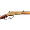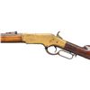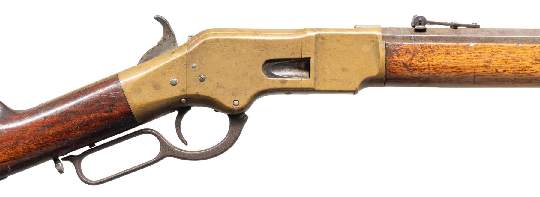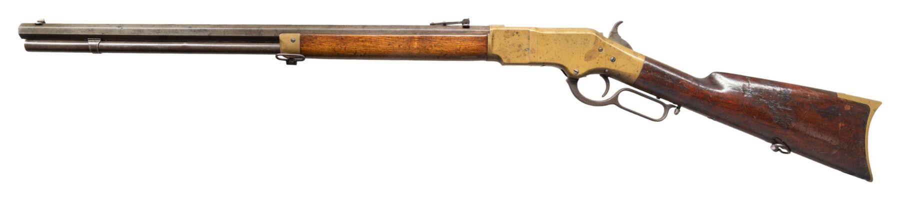 Cal. 44 HRF. S# 41200. Bbl. 24" octagon. Sporting front sight with graduated leaf rear sight. Full length mag. Brass action. Walnut forearm and straight grip stock featuring brass crescent buttplate, brass forearm cap, and sling swivels. Mfg. in 1870. CONDITION: brass action has a mild aged tarnish showing darker spotting with scattered scratches and dents. Bbl. and mag. tube finish has largely faded to gray. Sanded and refinished wood shows numerous scratches, marks, and dents. Stock has small chips around the top tang. Functioning action. Dark pitted bore retains largely intact rifling. PROVENANCE: The Esteemed Norm Greenberg Collection. (01-27754/DS). ANTIQUE. $3,000-5,000.
