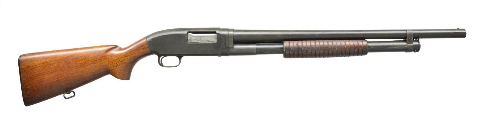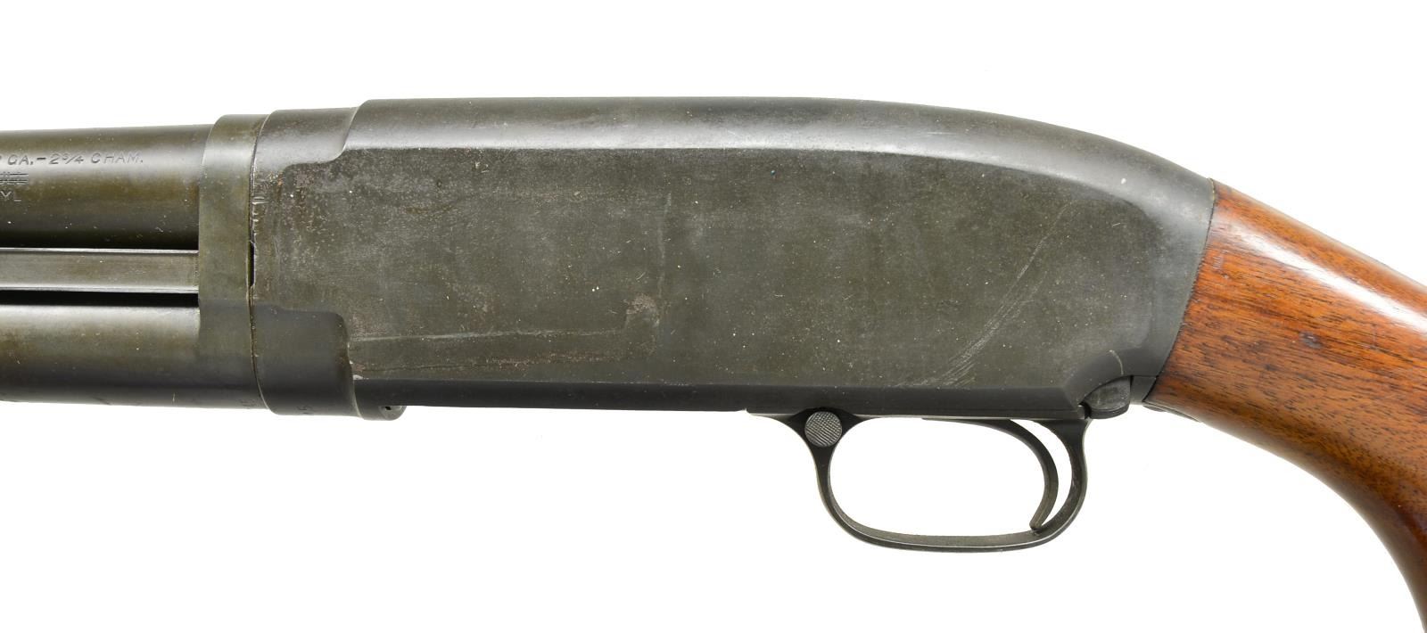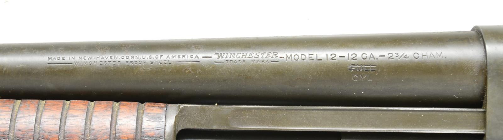 SHOTGUN. Cal. 12 Ga. S# 966245. Takedown. Bbl. 20 3/4", 2 3/4" chamber. Serial number matches on bottom of receiver & bbl. extension. Receiver marked "U.S." & "flaming bomb" below ejection port. Bbl. marked on top w/ "flaming bomb". Bbl. & receiver have "WP" proof. Bbl. markings on left side include "WINCHESTER MODEL 12-12GA.-2 3/4 CHAM. FULL." "FULL" is lined out & bbl. remarked "CYL". Bbl. band made w/out sling swivel. Silver colored bead front sight. Grooved walnut slide handle. Walnut buttstock marked on left side of cheek area w/ boxed "W.B." & "crossed cannons". Winchester marked checkered rubber buttplate. Buttstock has added sling swivel showing hobbyist gunsmith workmanship. CONDITION: buttstock has light wear & scattered handling marks. Finish on right side of buttstock near buttplate is lightly heat damaged. Notable dent at forward end of comb. Slide handle has notably darker stained worn finish w/ handling marks throughout. Metal has arsenal rework type parkerized finish w/ light wear & handling marks. Finish appears to be applied over light oxidation & pitting. Very good shiny bore. (22-1966/RW). MODERN. $1,000-2,000.