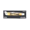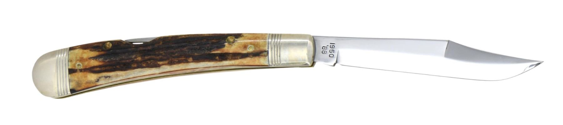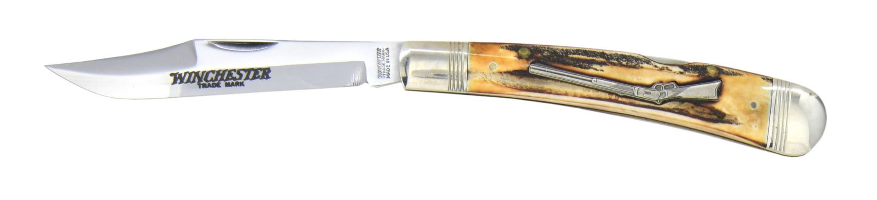 KNIFE. High quality single bladed folding knife. Blade measures 4 3/8". Knife measures 5 3/8" when closed. Blade is marked on left side w/ "WINCHESTER / trademark". Left ricasso marked "WINCHESTER / trademark / MADE IN USA". Right ricasso is marked "1950 / '88". Bone handle has Model 73 rifle inlay on right side. Knife has fitted box which is marked w/ the running Pony logo. CONDITION: knife & box are in very good to near new condition, except red box liner has a small area of loss. (02-23908/RW). NON-GUN. $400-600.