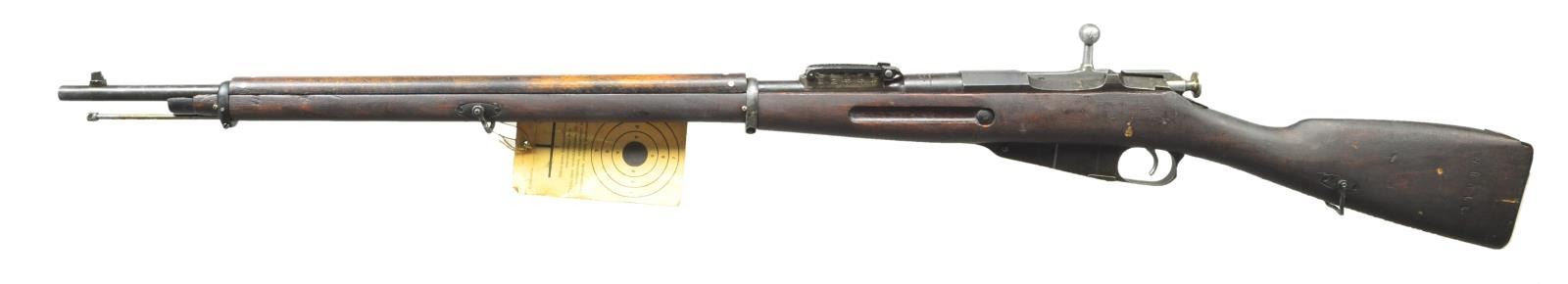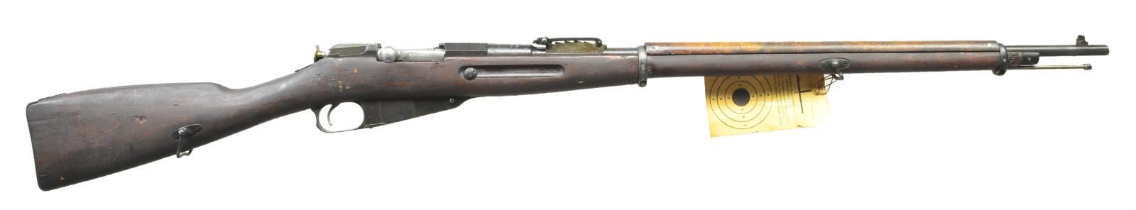 RIFLE Cal. 7.62x54R. S# 167160 (1897). Bbl. 31.6" w/ boxed "SA" marking. stepped front sight & tangent ladder rear sight remarked from archins to meters. Hex receiver w/ Russian imperial eagle & electro pencil S#. Bolt knob numbered to match. Russian style handguard w/ Finnish style birch stock w/ cleaning rod, sling swivels & w/out finger join construction. Stock is marked by peak of buttplate "577" & right side of buttstock "11994". UNATTACHED ACCESSORIES: Test fire hang tag. on front swivel. CONDITION: good overall arsenal refinish w/ wear & moderate marks. Metal fading to brown. Good handguard w/ crack near rear band. Very good stock finish w/ scattered gouges. Good bore w/ strong rifling. (01-21006/MD). ANTIQUE. $300-400.