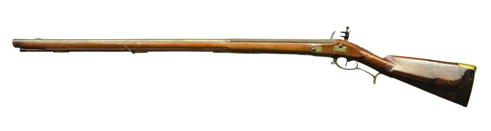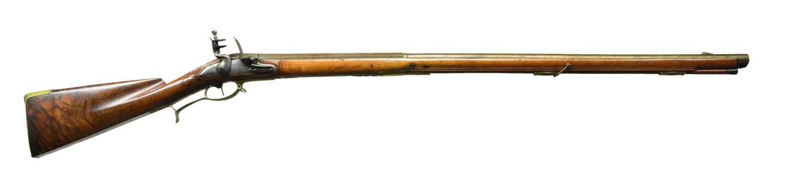 FLINTLOCK MUSKET. Cal. 60. NSN. Bbl. 35 1/4" smoothbore rnd. to oct. w/ faceted transitions. Blade front sight. Full length pinned walnut stock w/ forearm swivel. Ebony tip, & wooded ramrod tip. Brass furniture includes 2 ornate ramrod pipes, ornate thimble, 2 lockplate escutcheons w/ oak leaf border engraving, finger curl trigger guard & buttplate. Ornate cravings to include borders along ramrod channel, ornate floral motifs behind thimble & behind breech tang, large circular points behind stock ears & decorative enlarged left side shadowline cheekpiece. CONDITION: bbl. has faded to a light brown tone & patina appearance w/ some spots of light pitting. Good wood varnish w/ considerable impressions & scratches throughout. Brass has pleasing mustard patina appearance w/ dents & marks on buttplate. Good bore. PROVENANCE STATEMENT: Estate collection of Thomas F. Wolfinger. (01-22169/MD). ANTIQUE. $400-600.
