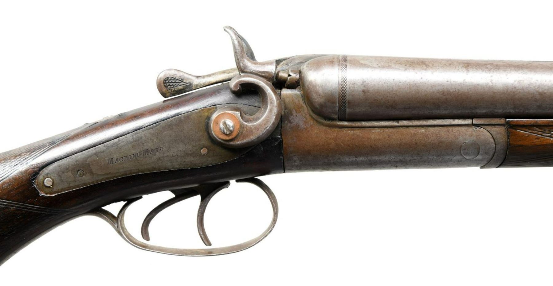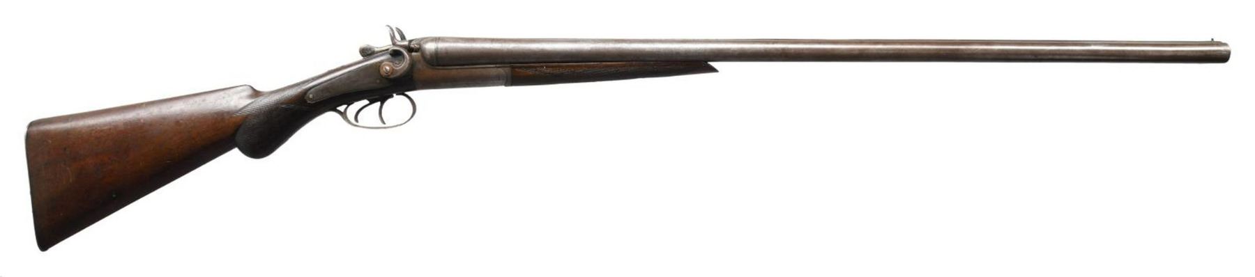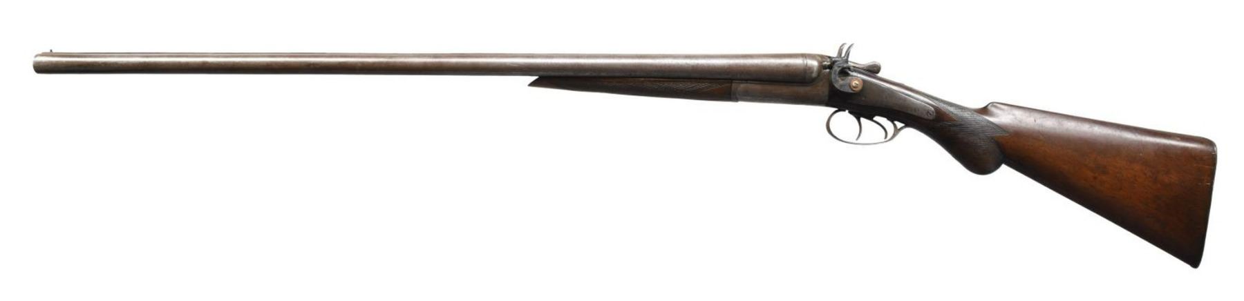 Cal. 12 Ga. NSN. Bbl. 30". SxS hammer shotgun mfg. Wm. Parkhurst. Left sideplate is marked "Wm. PARKHURST", with "MACHINE MADE" on the right. Steel bbls. with knurled bands at breeches. Hammers are replacements, being held in place with improper screws and brass washers. Checkered round knob buttstock and forend. Brass bead front sight. CONDITION: metal components exhibit a gray patina, with scattered spots of discoloration and spots of oxidation overall. Bores are bright, exhibiting areas of pitting throughout. Wood furniture exhibits scattered marks from handling and storage. (23-4856/MLW). CURIO. $50-100.