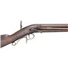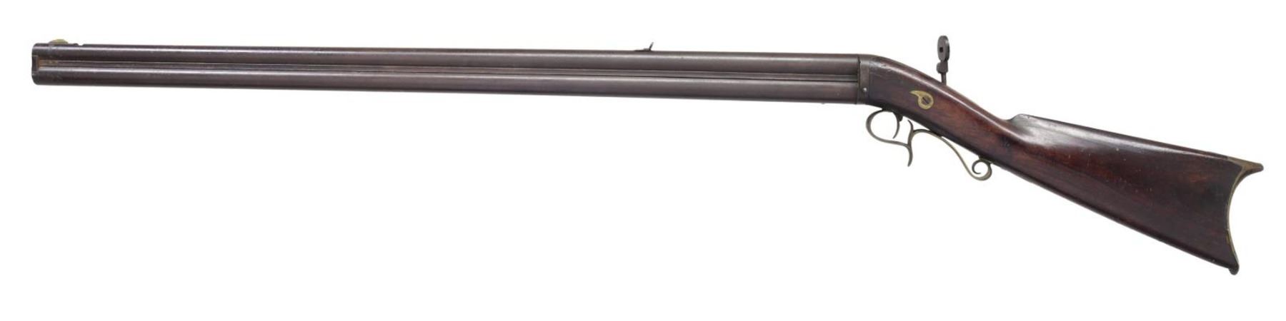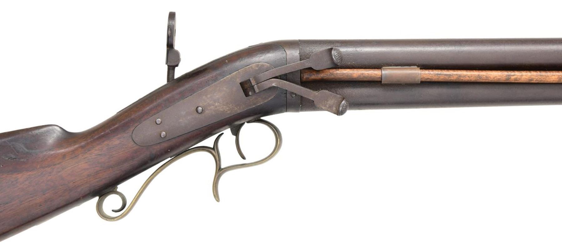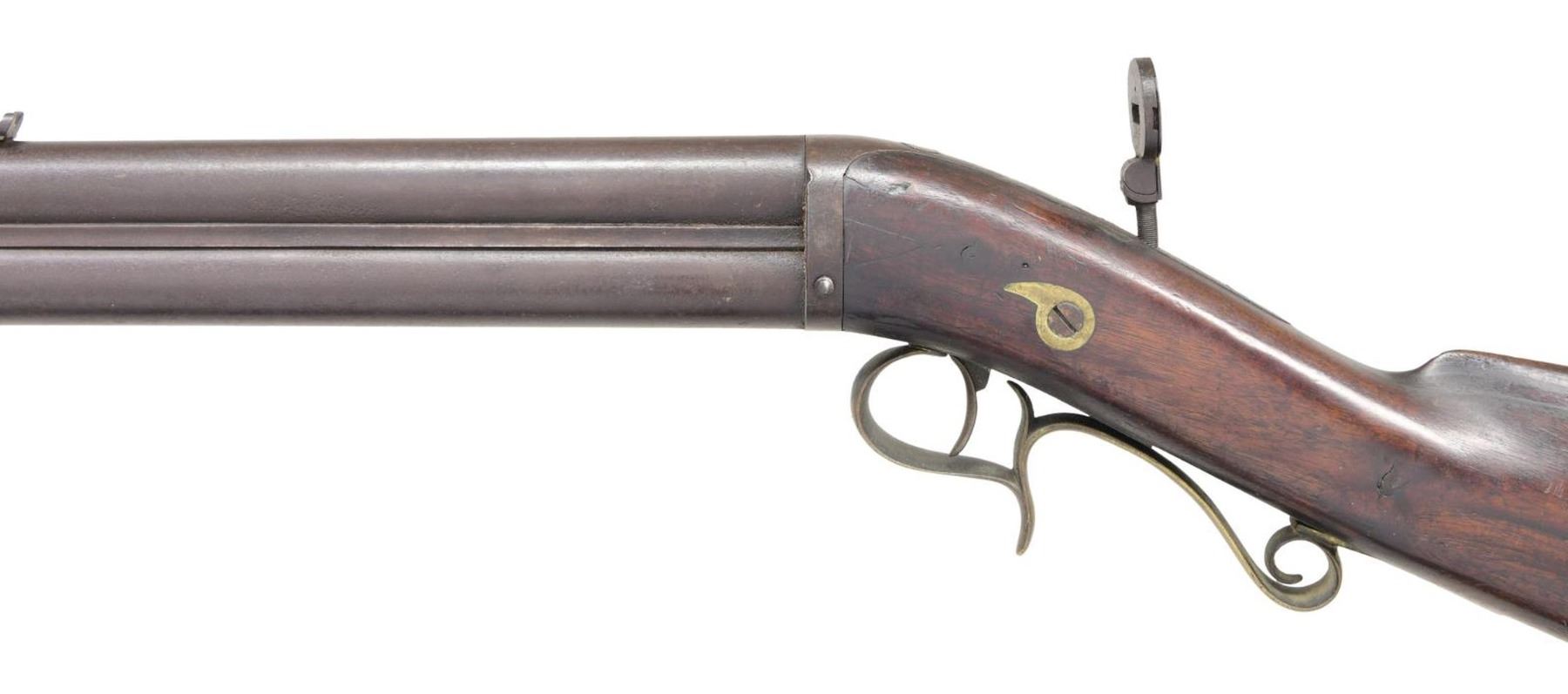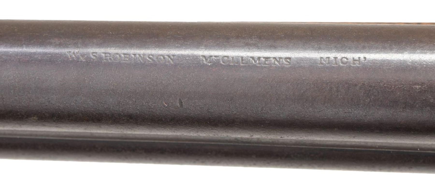 EAR O/U PERCUSSION PARADOX RIFLE. Cal. 41 / 16 Ga. (Active 1857-1867). NSN. This ball-and-shot gun has O/U round 30.5" barrels. Top barrel has a German blade front sight, dovetail behind front sight, a semi-buckhorn rear sight, and a lollipop tang sight. Top of the barrel is marked "Wn W ROBINSON M CLEMENS MICH". Right side of the barrels has three pipes holding a hardwood ramrod. Right side "mule ear" lock has a single conventional trigger. Walnut buttstock has a brass finger curl trigger guard, circular patch box, teardrop lock sideplate, and a crescent buttplate. CONDITION: iron parts have dark patina and corrosion with prior pitting, notably around the nipples. Good walnut varnish, showing stress cracks through the knot on the right side of the buttstock, along with scattered cracks and impressions. Trigger guard is bent toward the right-hand side, with a portion of the rear tang protruding from the stock. Toe of the buttstock has a missing chip, and the toe of the buttplate is bent inward. Notable wood shrinkage around buttplate has buttplate protruding. Dark, pitted bores. Hammers appear to function. (01-24331/MD). ANTIQUE. $800-1,200.
