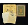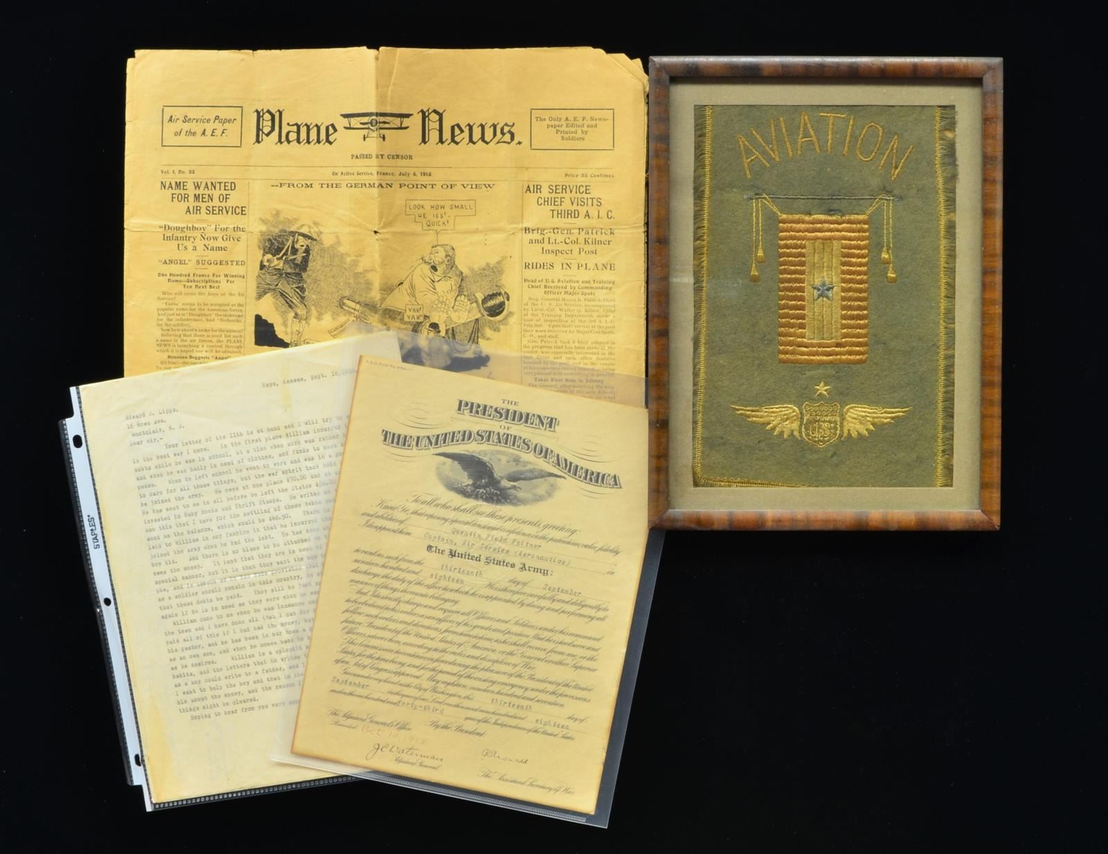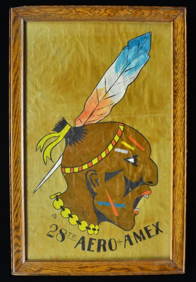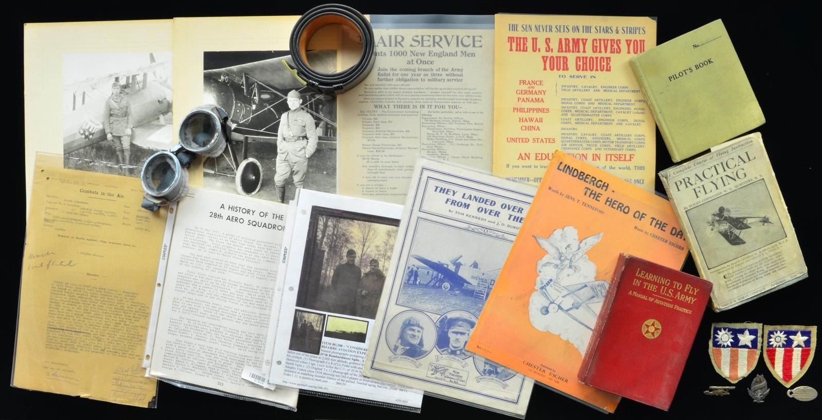 MATERIAL. This interesting group includes a 26" x 17" hand painted, WWI 28th Aero Squadron broadside depicting an Indian yelling. This was likely taken from the side of a plane. / A WWI Son in Service banner that reads, "AVIATION" & shows a pair of senior pilot wings. / A lg. 14" x 11" photograph on card of a WWI heavily decorated US pilot standing by his plane. / A lg. 14" x 11" photograph on card of another WWI US pilot standing by his plane. / A WWI Combat in Air report. / A multi page report on the history of the 28th Aero Squadron. / A 2 volume set of books titled, "Learning to Fly in the US Army" published in 1917. / A book titled, "Practical Flying" published in 1918. / A sm. book titled, "Pilot's Book" used to record flights & work done on airplanes. / A black leather belt in original cardboard box w/ a label that reads, "Belt, Flying Cadet, black patent leather, Dress Size 32 in.". / A pair of WWI flight goggles in original box. / A piece of sheet music titled, "Lindberg the Hero of the Day". / A piece of sheet music titled, "THEY LANDED OVER HERE FROM OVER THERE". / A photo of 2 pilots during WWI. / 2 Sm. format WWI recruiting posters for the Air Service. / A lg. folder containing numerous documents & photos relating to the WWI Air Corps. / 2 WWII CBI patches. / 3 Sm. aviation related pins. CONDITION: all items show light to moderate wear. Most paper items have been well preserved. Photographs are clear & undamaged. Goggles & belt appear unissued. Squadron painting is quite sharp w/ vivid colors. (02-16414/BF). $700-1,000.