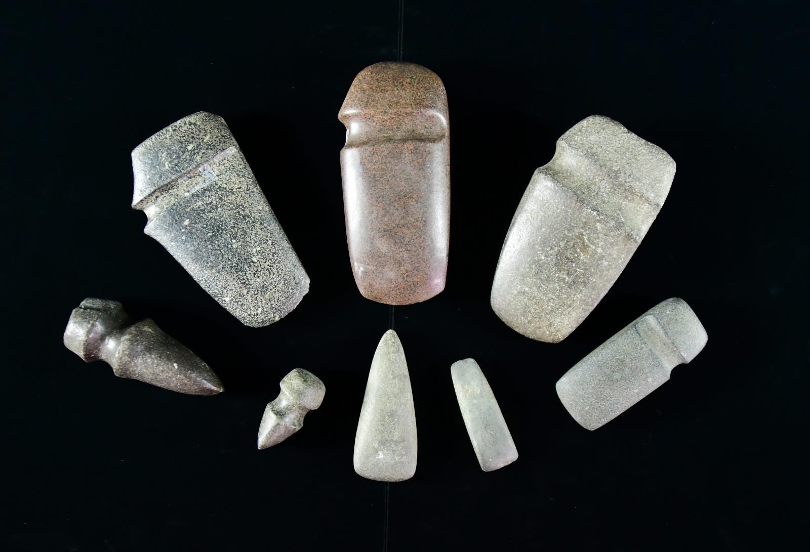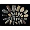 AMERICAN AXES, CELTS, & HAMMERSTONES. 34 examples in all, some show extreme skill in hard rock with deep grooves for attachment to haft. Some have old painted IDs as to where found. Largest are about 9". CONDITION: very good overall for ancient stone artifacts. PROVENANCE: from The Lifelong Collection of Glen E. Mattox. (02-18919-2/JS). $500-1,000.