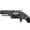 Cal. 32 RF Long. S# 36365. Bbl. 6" octagon with integral rib having brass blade half moon sight; notch in top mounted cylinder stop serves as the rear sight. Mfg. 1861-1874 (77,155 units) with unfluted 6 rd. cylinder having patent dates around its circumference at the midpoint. Referred to as No. 2 Old Army, yet none were for military contract. History notes one owned by President Hayes, Wild Bill Hickock (on his person when he died) and 2 by Gen. George Custer; very popular during the Civil War. Matching numbered Rosewood grips plus "GG8" on cylinder, barrel and lower left side of back strap under grips. Later production model as evidenced by 3 pins in top strap. Although engraving is not signed (Nimschke only signed 15% of handguns that he engraved), it is certainly of the Nimschke "New York" style having foliate scrollwork with rounded terminals. Louis D. Nimschke (1832-1904) trained in Germany under masters Ernst Moritz and Gustav Ernst before coming to America in 1853 where he began his prolific career in New York City. It is referenced that he engraved about 5,000 firearms and other pieces from 1850 to 1900 (about 2 per week!). His work is even recognized by the Smithsonian Institute. He created many "pulls" from his engravings as well as from other engravers which are compiled in a work book given to the Metropolitan Museum of Art on its 150th Anniversary (2018) by the Robert M. Lee Foundation. Engraved post manufacture over original roll markings. UNATTACHED ACCESSORIES: good presentation case of nicely grained wood that appears to be Rosewood; light weather checks following the grain plus very light scratches throughout. Interior is compartmentalized with a roughly relieved semi-circle between 2 compartments (purpose unknown). Lining is a faded maroon velvet with padding in the lid. Simple brass hinges and 2 post lock (no key). Top of lid has shaped German silver inlaid plaque for engraving. An empty 2-piece cartridge box by Smith, Hall & Farmer fills one compartment having spectacular conditioned label that lists "Fifty No. 2 or 32-100". CONDITION: by antique standards, this would be near the top of condition; further description will show how fine it is by any standard. Bluing is very good to excellent with an occasional small scratch such as on the bottom of the barrel. The back strap and bottom of the front strap have faded, thinning finish. Wonderful grips with indexed screw and very minimal handling marks. Very vivid, bright case colors. No damage to screw slots. Very slight cylinder turn line. Timing is as fine as from the time period it was made. Bore is bright and shiny with distinct rifling having no signs of wear, but with some scattered light pitting. Face of cylinder and areas around firing pin slot plus breech end of barrel have evidence of firing. Overall, a wonderful engraved No. 2. (01-26859/NW). ANTIQUE. $8,000-12,000.