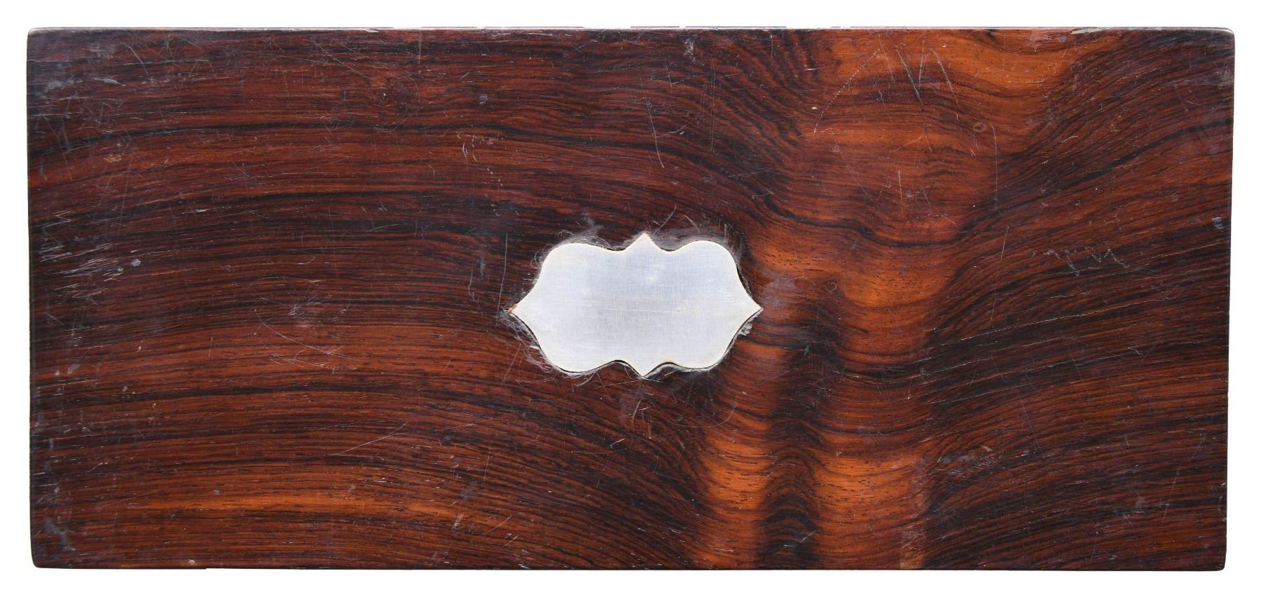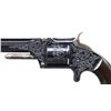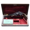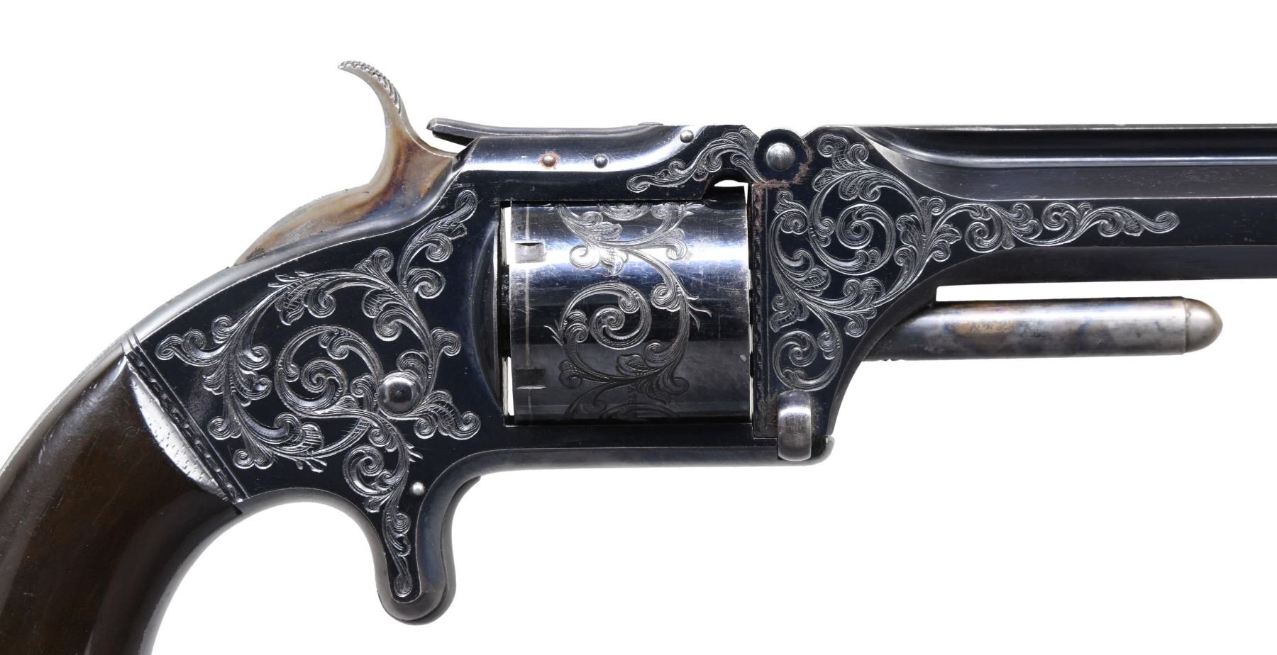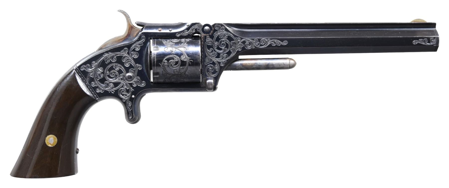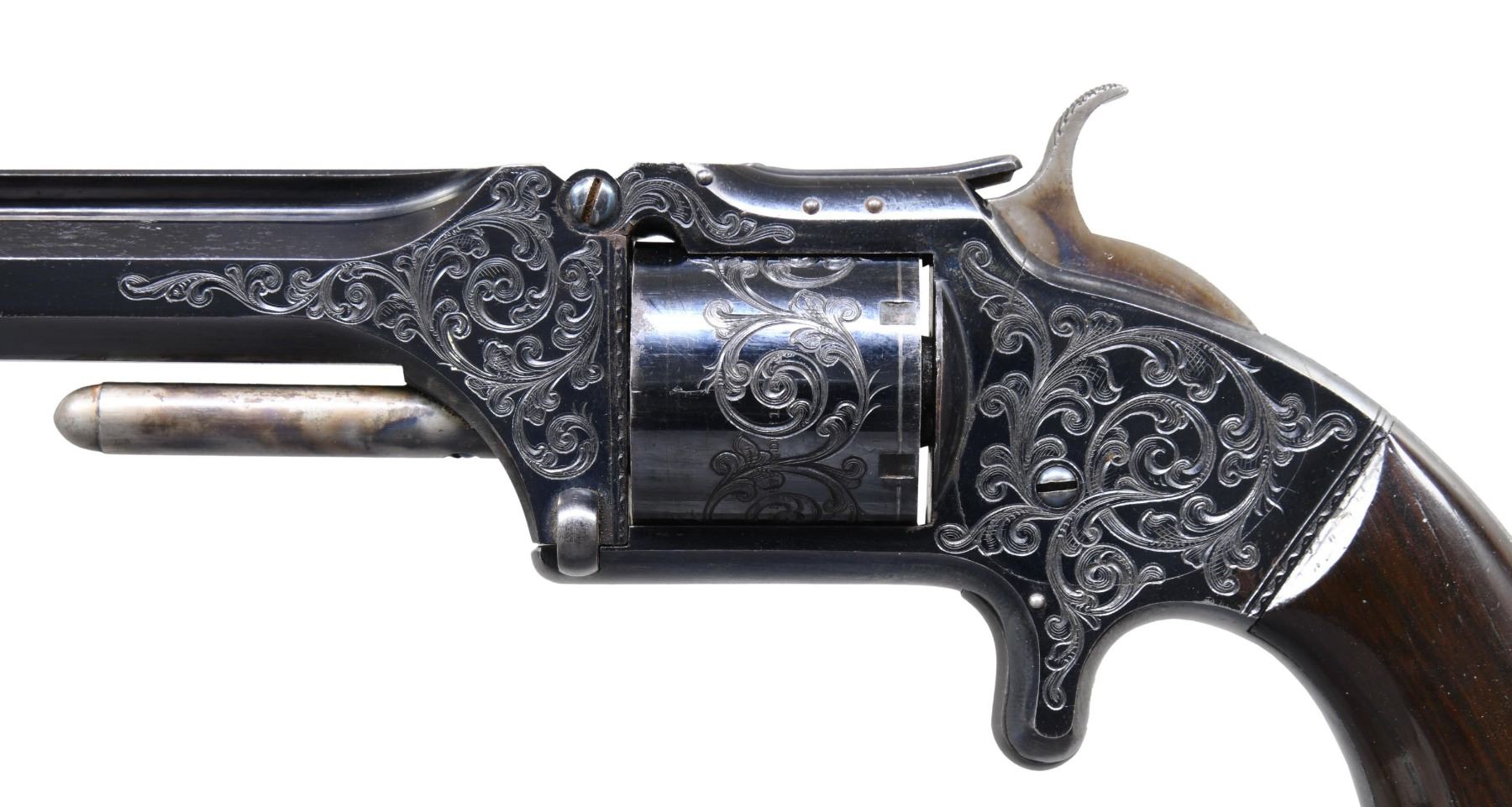 STYLE ENGRAVED. Cal. 32 RF Long. S# 36365. Bbl. 6" octagon with integral rib having brass blade half moon sight; notch in top mounted cylinder stop serves as the rear sight. Mfg. 1861-1874 (77,155 units) with unfluted 6 rd. cylinder having patent dates around its circumference at the midpoint. Referred to as No. 2 Old Army, yet none were for military contract. History notes one owned by President Hayes, Wild Bill Hickock (on his person when he died) and 2 by Gen. George Custer; very popular during the Civil War. Matching numbered Rosewood grips plus "GG8" on cylinder, barrel and lower left side of back strap under grips. Later production model as evidenced by 3 pins in top strap. Although engraving is not signed (Nimschke only signed 15% of handguns that he engraved), it is certainly of the Nimschke "New York" style having foliate scrollwork with rounded terminals. Louis D. Nimschke (1832-1904) trained in Germany under masters Ernst Moritz and Gustav Ernst before coming to America in 1853 where he began his prolific career in New York City. It is referenced that he engraved about 5,000 firearms and other pieces from 1850 to 1900 (about 2 per week!). His work is even recognized by the Smithsonian Institute. He created many "pulls" from his engravings as well as from other engravers which are compiled in a work book given to the Metropolitan Museum of Art on its 150th Anniversary (2018) by the Robert M. Lee Foundation. Engraved post manufacture over original roll markings. UNATTACHED ACCESSORIES: good presentation case of nicely grained wood that appears to be Rosewood; light weather checks following the grain plus very light scratches throughout. Interior is compartmentalized with a roughly relieved semi-circle between 2 compartments (purpose unknown). Lining is a faded maroon velvet with padding in the lid. Simple brass hinges and 2 post lock (no key). Top of lid has shaped German silver inlaid plaque for engraving. An empty 2-piece cartridge box by Smith, Hall & Farmer fills one compartment having spectacular conditioned label that lists "Fifty No. 2 or 32-100". CONDITION: by antique standards, this would be near the top of condition; further description will show how fine it is by any standard. Bluing is very good to excellent with an occasional small scratch such as on the bottom of the barrel. The back strap and bottom of the front strap have faded, thinning finish. Wonderful grips with indexed screw and very minimal handling marks. Very vivid, bright case colors. No damage to screw slots. Very slight cylinder turn line. Timing is as fine as from the time period it was made. Bore is bright and shiny with distinct rifling having no signs of wear, but with some scattered light pitting. Face of cylinder and areas around firing pin slot plus breech end of barrel have evidence of firing. Overall, a wonderful engraved No. 2. (01-26859/NW). ANTIQUE. $4,000-6,000.