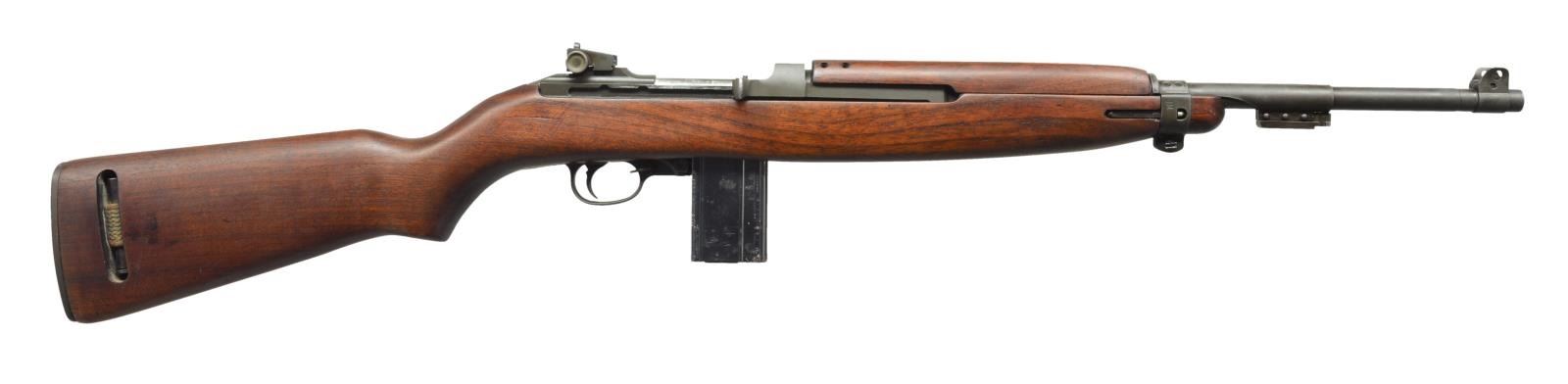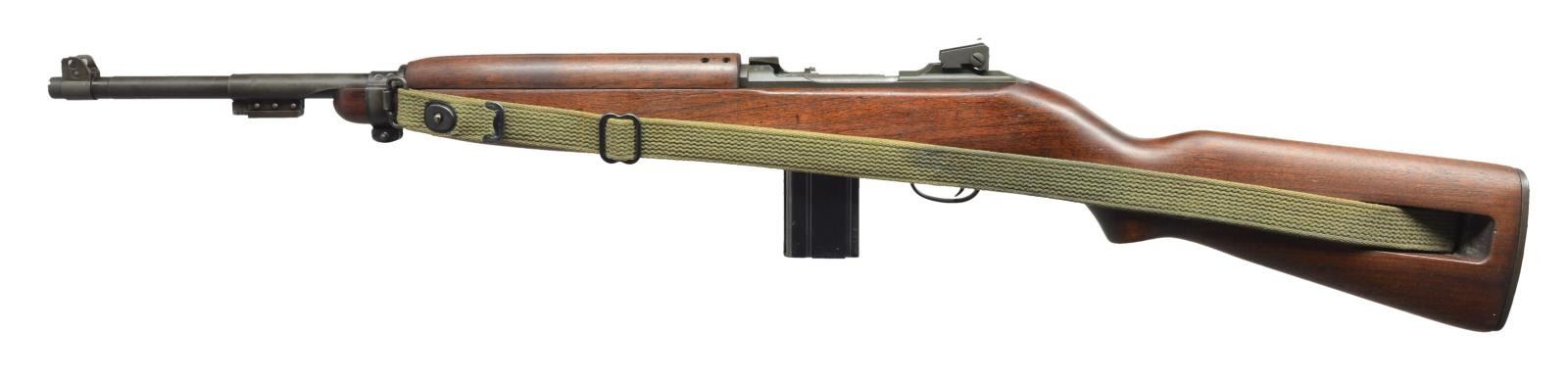 Cal. 30 Carb. S# 2665123. Very nice appearing example of US Carbine as arsenal reworked. Bbl. 18", marked behind front sight "UNDERWOOD 1-44 flaming bomb". Milled aperture rear sight marked w/ "H" in shield. Blade front sight w/ protective ears marked "J-Q". Front band w/ bayonet lug marked "JM". Straight cut slide marked w/ indistinct markings. Rnd. bolt marked "IO". Milled trigger housing marked "INLAND". Rotary safety. Mag. catch has extension for 30 rd. mags. Straight cut hammer marked "W". Perch belly low wood oval cut unmarked replacement buttstock. 4 Rivet handguard marked "SA". Green web sling. MAGS: 1-15 rd. CONDITION: stock set has very light wear w/ scattered sm. handling marks. Metal retains 85% of arsenal rework parkerization. Finish on bolt is notably thin. Very good shiny bore. (21-1391/RW). CURIO. $600-900.