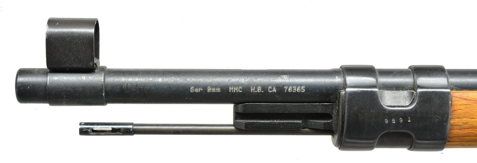 Cal. 8 mm Mauser. S# 9891m. Bbl. 23 5/8", import marked on left side. All visible numbers match. Rifle is restored "Russian capture" w/ "X" marked on left side of receiver ring & German markings partially obliterated. Receiver marked on left rail "Mod 98". Receiver ring marked on top w/ "Waffenamt WAA???" "dou" "44". Bbl. marked over chamber w/ "E" "K" "dou". Tangent rear sight graduated to 2000m. Inverted "V" front sight w/ protective hood. Cleaning rod is present. Furniture is milled except for cup type buttplate & takedown hole. Laminated stock set marked only w/ S#. Reproduction leather sling. CONDITION: entire rifle has been given arsenal rework finish, wood & metal are near good to excellent w/ scattered sm. handling marks. Bolt is polished bright. Near excellent shiny bore. (21-1475/RW). CURIO. $600-900.