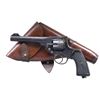 Cal. 455 Webley. S# 166336. Bbl.6". Blade front sight. V-notch rear sight. All matching numbers. Cyl. has been shaved for 45 ACP/AR ammo. 1915 dated Webley MKVI revolver. Parts have various British military inspection stamps such as Broad Arrows but revolver lacks British sale proofs. Arsenal blue finish. Checkered brown grips. Lanyard ring present on bottom of grip frame. UNATTACHED ACCESSORIES: aftermarket black hardcase with unmarked brown leather holster. CONDITION: grips show heavy handling wear with some worn checkering. Metal retains 60% arsenal blue with scattered fading to gray, edge wear, some light dings & oxidation spots. Action functions properly when hand cycled. Good bright bore with some light oxidation. (24-6900/MJC). CURIO. $350-550.