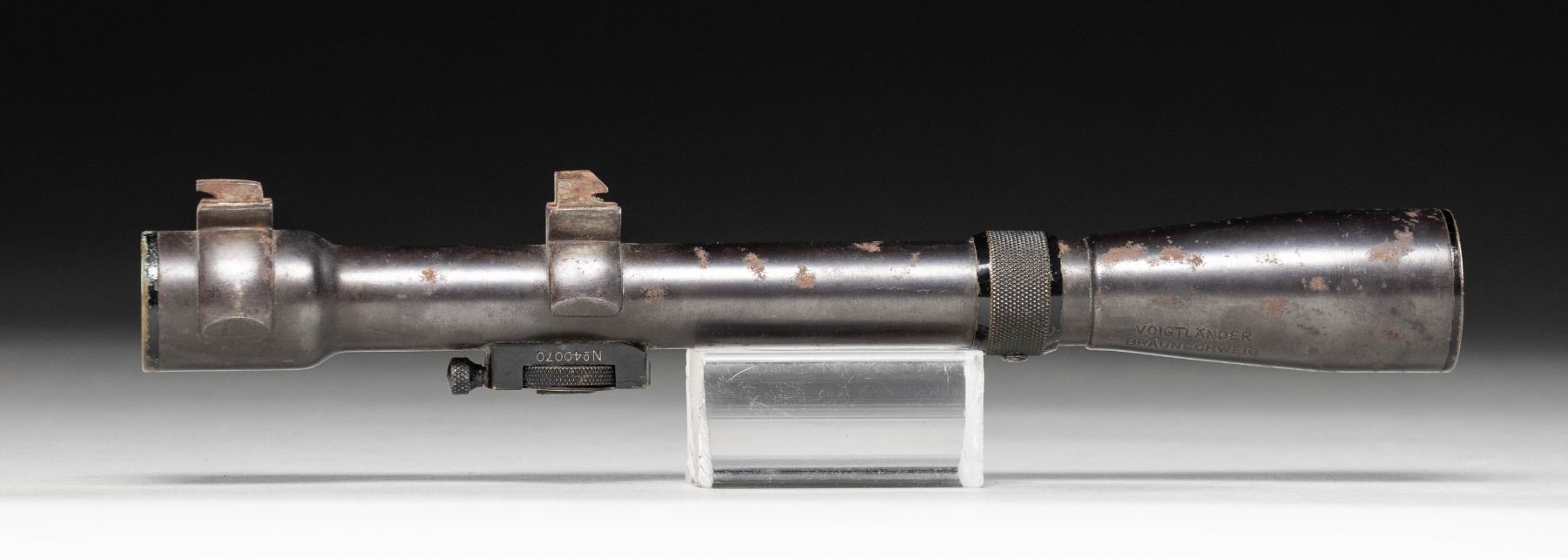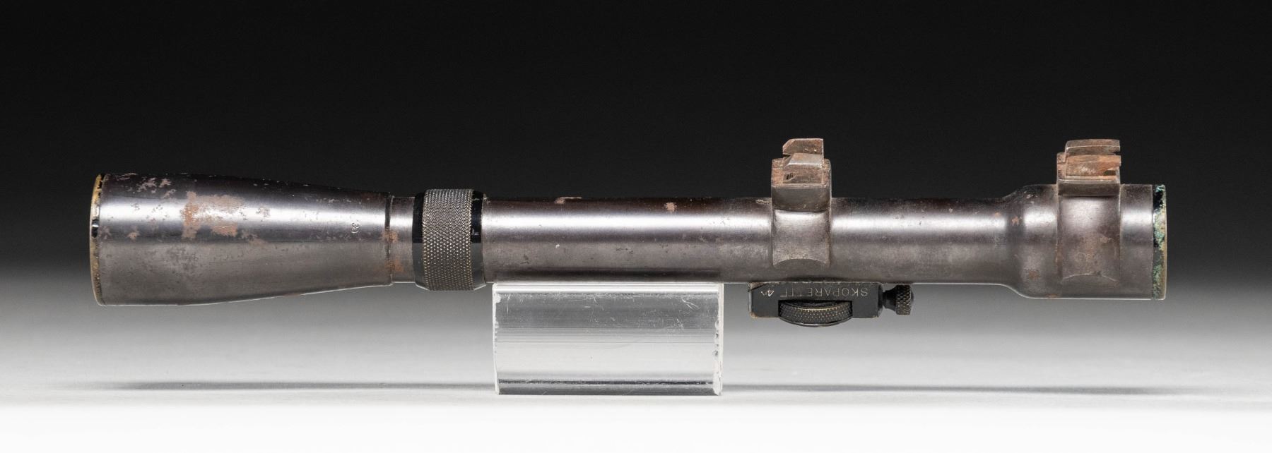 WW1 era Voightlander 4x power Skoparette scope. Top dial lacks visible measurements Scope has a post reticle with good optics that have a slight green tint. This type of scope was used by Bavarian snipers during WW1 but no additional serial number is present on tube. Scope has dual claw style rings. CONDITION: tube shows scattered oxidation & edge wear. (02-25993/MJC). $300-500.