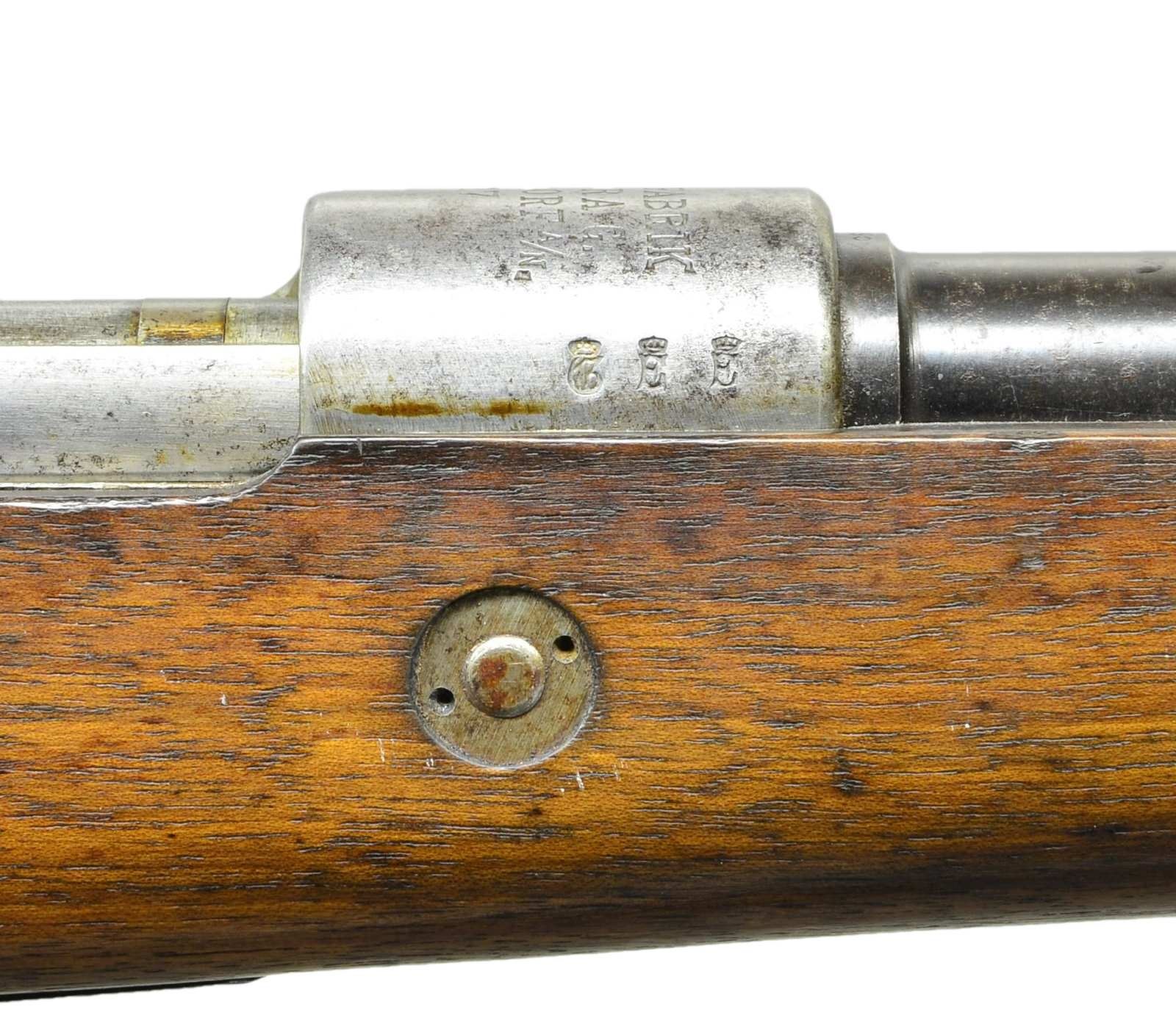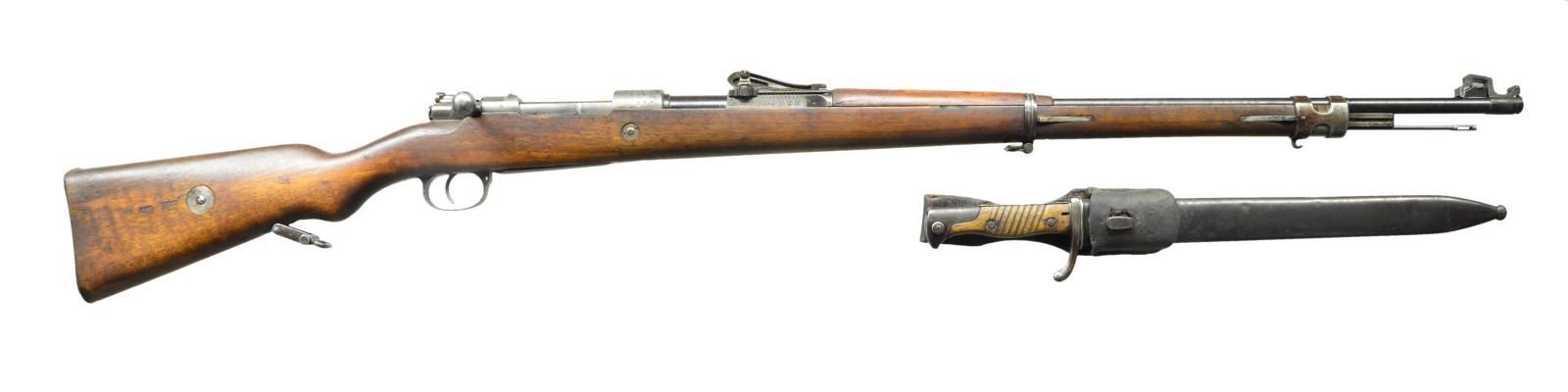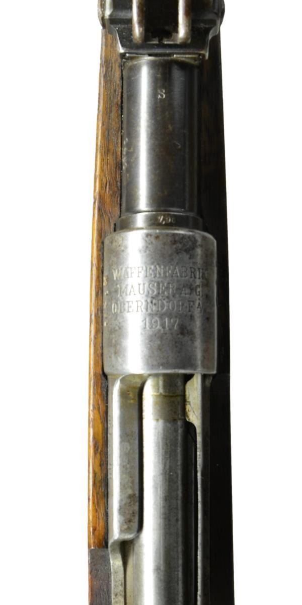 MILITARY RIFLE. Cal. 8mm Mauser. S# 1491aa all visible numbers match except for period replacement butt stock. Bbl. 29 1/4". Receiver ring marked on top “WAFFENFABRIK MAUSER A.G. OBERNDORF A/N. 1917”. Right side of receiver ring has Imperial proofs. Left side has eagle acceptance stamp. Left rail “Gew. 98.”. Bbl. marked “S” over chamber. Bayonet bar, cleaning rod & parade hook are present. Lower band has bottom swivel. QD swivel is present at butt. Walnut stock set. Imperial acceptance marks present on right side of butt. Unmarked steel marking disc. UNATTACHED ACCESSORIES: model 1898/05 bayonet 14 1/2" fullered plain back blade. Blade marked on left ricasso “WAFFENFABRIK MAUSER A.G. OBERNDORF A.N.”. Back of blade marked with crown “W 17”. Grooved walnut grips. Flash guard is present. Unmarked steel scabbard w/ black leather frog. Blade has been sharpened. Bright metal turning gray & patina. Blade has oxidation & etched appearance. Scabbard has traces of blue turning patina w/ oxidation & fine pitting. Noticeable small dents. Well worn frog w/ loose stitching, flexing & scuffing. Muzzle cap & sight protector appears to be steel & zinc construction marked with crown “N” & boxed “W.KOBER & SUHL”. CONDITION: stock has light wear, staining & handling marks w/ arsenal rework type finish. Bright metal parts turning gray. Balance of metal has 50% original thinning worn blue. Fair worn bore turning dark in grooves. (23-52/RW). CURIO. $900-1,200.