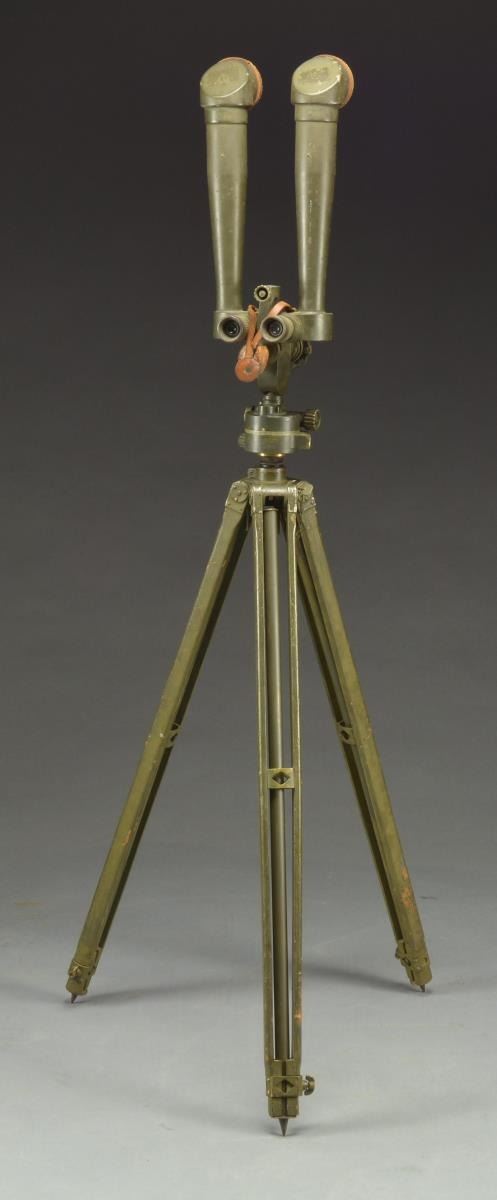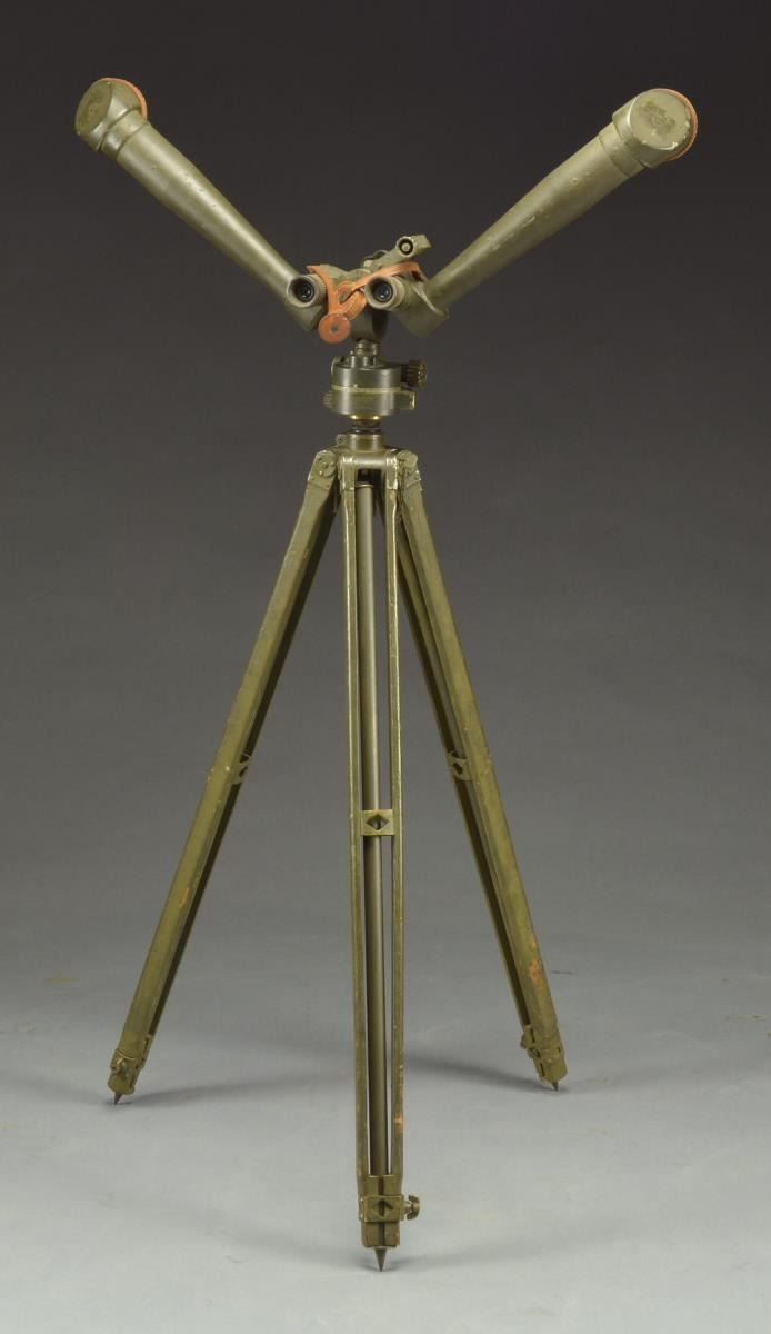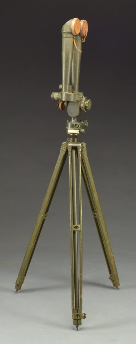 A blast from the past of military trench warfare. Complete w/ the original tripod, an interesting periscope designed to keep the operator below the line of fire this range finder mfg. by B&L Optic Co. Still retains leather lens covers. The entire unit is painted green & wears a tag that reads "WWI Artillery Range Periscope Norfolk Light Artillery Blues 111th FA 29 th Division. Purchased VA Bch, VA. 2008". Bottom of right eye piece engraved " B.C. Telescope / Model of 1915 A1 / Field 4-15 Power 10 / B&L OPT. CO. 5/8 R.O.C. / 632. CONDITION: everything appears to move fluidly & factory TE mechanism appears to function correctly. Glass is a little foggy but reticle is still quite readable.