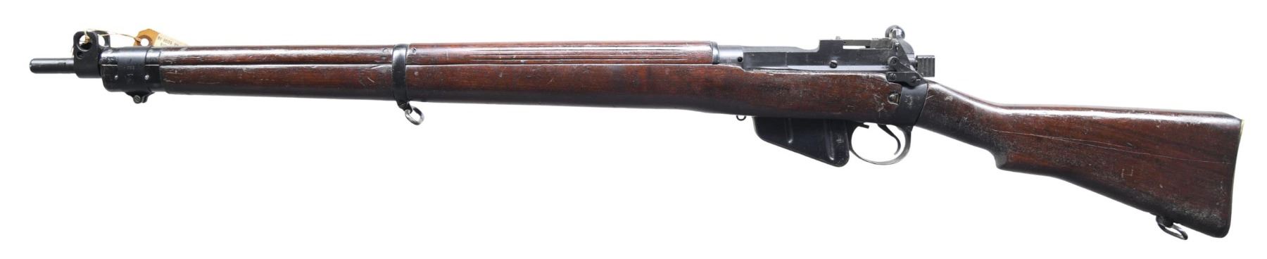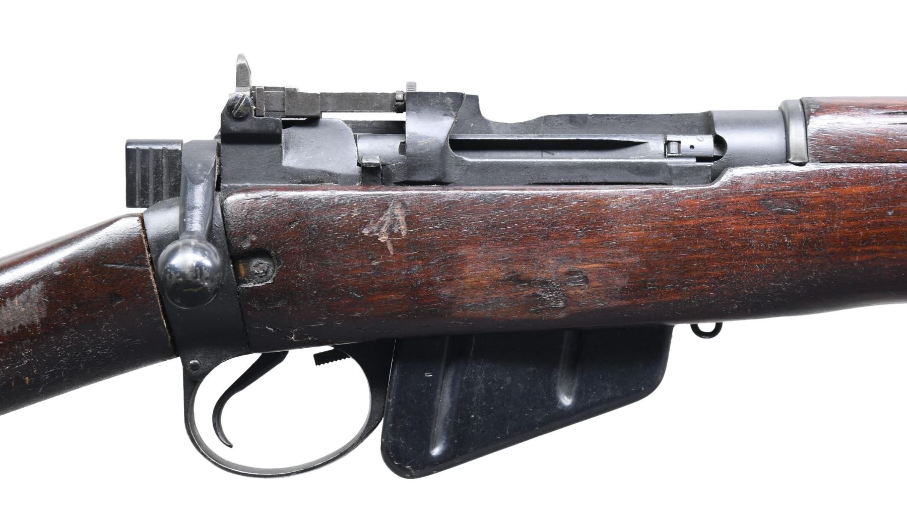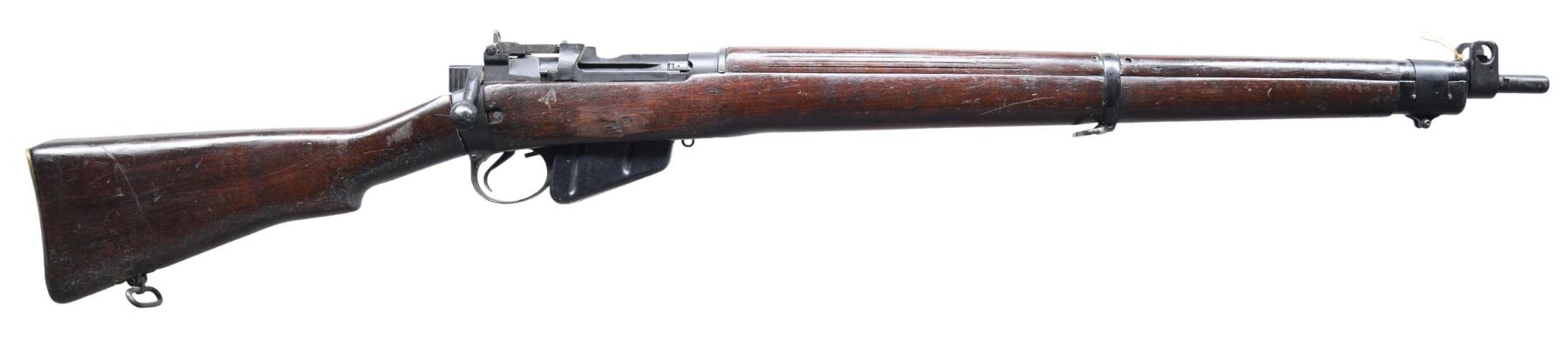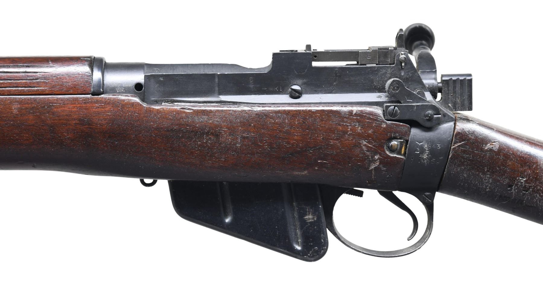Cal. 303 Brit. S# BF11959. Bbl. 25". Blade front sight with protective ears. Ladder aperture rear sight graduated to 1300yds. Matching numbers on socket, bolt, forend & mag. Left side of socket has serial, 1943 date & Interarms import marking. Left side of receiver has "303 Brit UK" import marking. Suncorite finish. Hardwood stock set with bottom mounted sling swivels. MAGS: 1-10 rd. detachable & matching numbered to rifle. CONDITION: stock set has added finish with scattered white staining, dings, scratches & handling marks. Metal retains 90% arsenal rework Suncorite finish with some flaking ,edge wear, finish overrun & light oxidation. Action is a bit sluggish but functional when hand cycled. Very good bright bore with strong rifling. (25-2877/MJC). CURIO. $400-600.