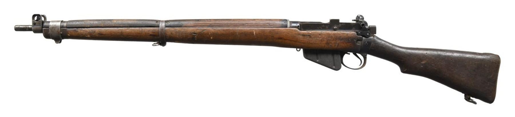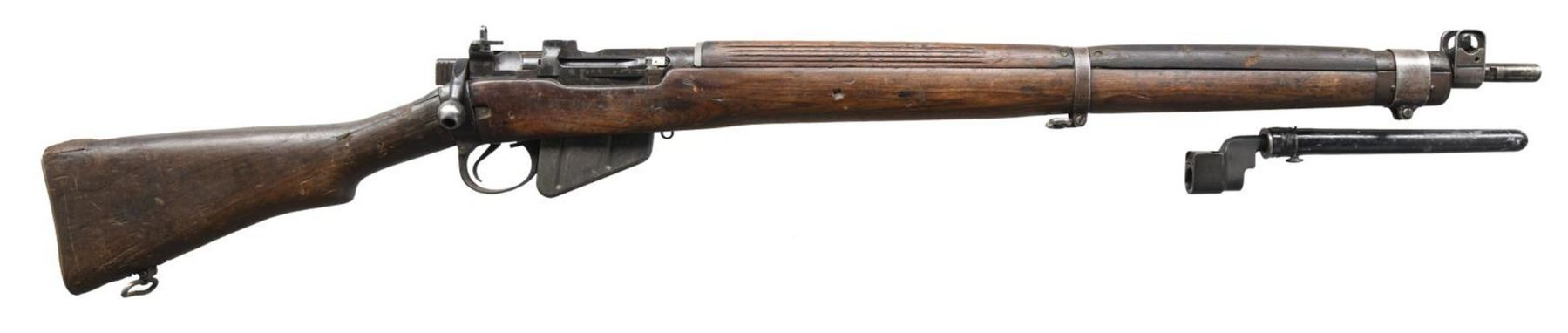 Cal. 303 Brit. S# 47C3167. Bbl. 25 1/2" w/ import marking. Blade front sight w/ protective ears. Flip rear sight w/ 300 & 600yd apertures. Mismatched number on bolt. Other parts appear unnumbered. Top left of receiver has "U.S. PROPERTY" marking. Left side of socket has serial stylized Savage "S" marking & 1943 date. Hardwood stock set w/ bottom mounted sling swivels. MAGS: 1-10 rd. detachable. UNATTACHED ACCESSORIES: No. 4 spike bayonet & scabbard that show scattered white staining & oxidation. CONDITION: Handguard has a loose fit to the stock. Stock set shows a few armorer splice repairs,extensive wear, some chipping, dings & handling marks. Metal has a mix of arsenal parkerized & blued finishes that are turning gray w/ oxidation & some scattered pitting. Good bore that is mostly bright w/ some dings, light pitting & frosting. (23-2669/MJC). CURIO. $400-600.
