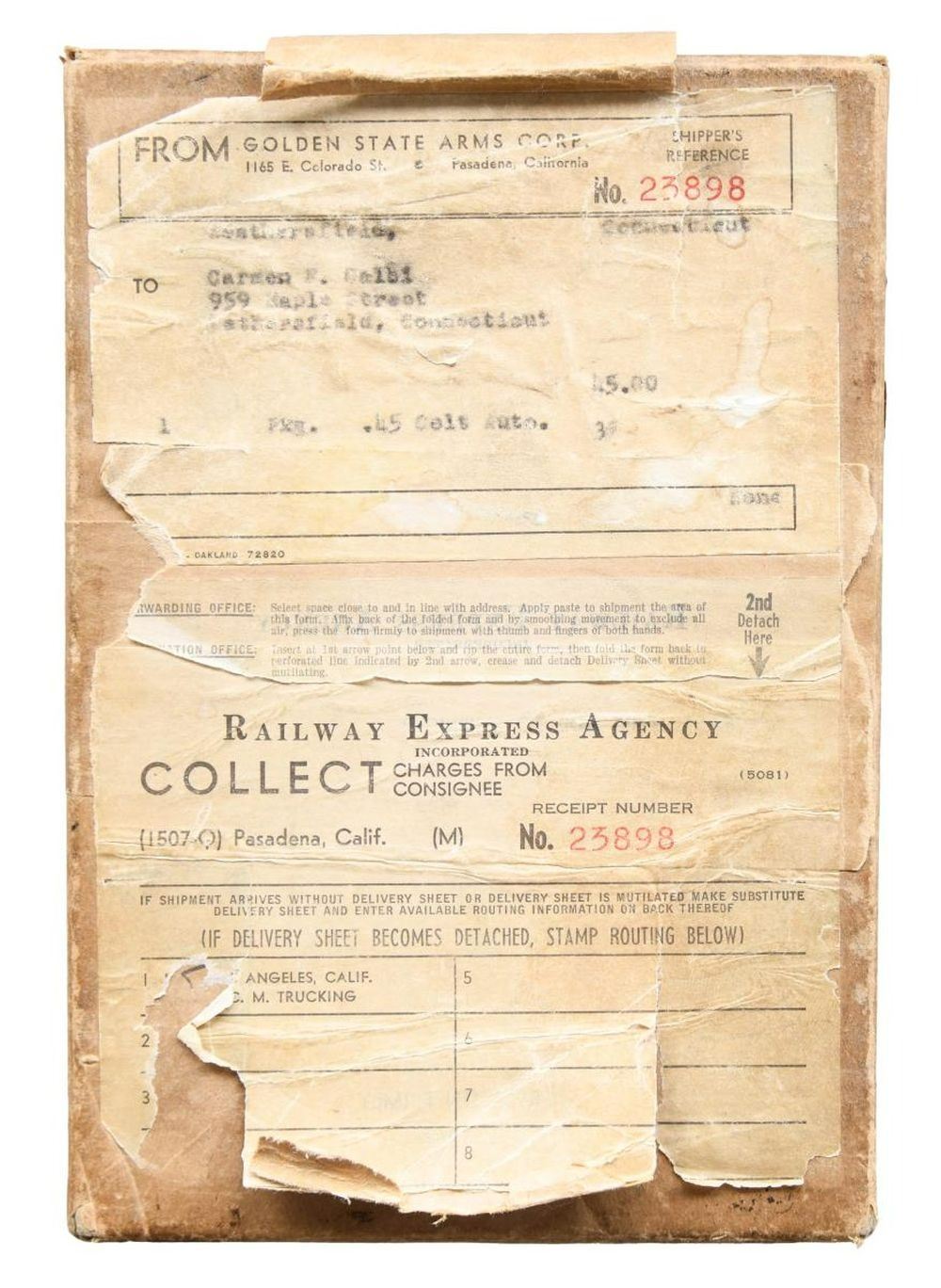 Cal. 45 ACP. S# 721846. Bbl. 5" unmarked & parkerized. Round blade front sight. Fixed u-notch rear sight. Augusta Arsenal rebuilt WW2 1911A1 pistol. Colt slide numbered "721851" above firing pin channel. Right side of frame has upside down "AA" Augusta Arsenal marking & double stamped "DOD" eagle marking. Keyes Fibre grips. MAGS: 1-7 rd. Scovil mfg. UNATTACHED ACCESSORIES: Kraft box w/ Golden State Arms & Railway express receipt on the outside lid for a Colt 1911A1 pistol. The receipt unfortunately does not list a serial number for the pistol. CONDITION: grips show light handling wear. Metal retains 95% arsenal rework parkerized finish. Very good bore w/ some dried cosmoline. (23-2621/MJC). CURIO. $1000-1500.