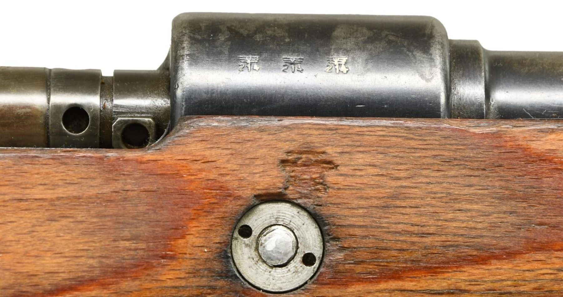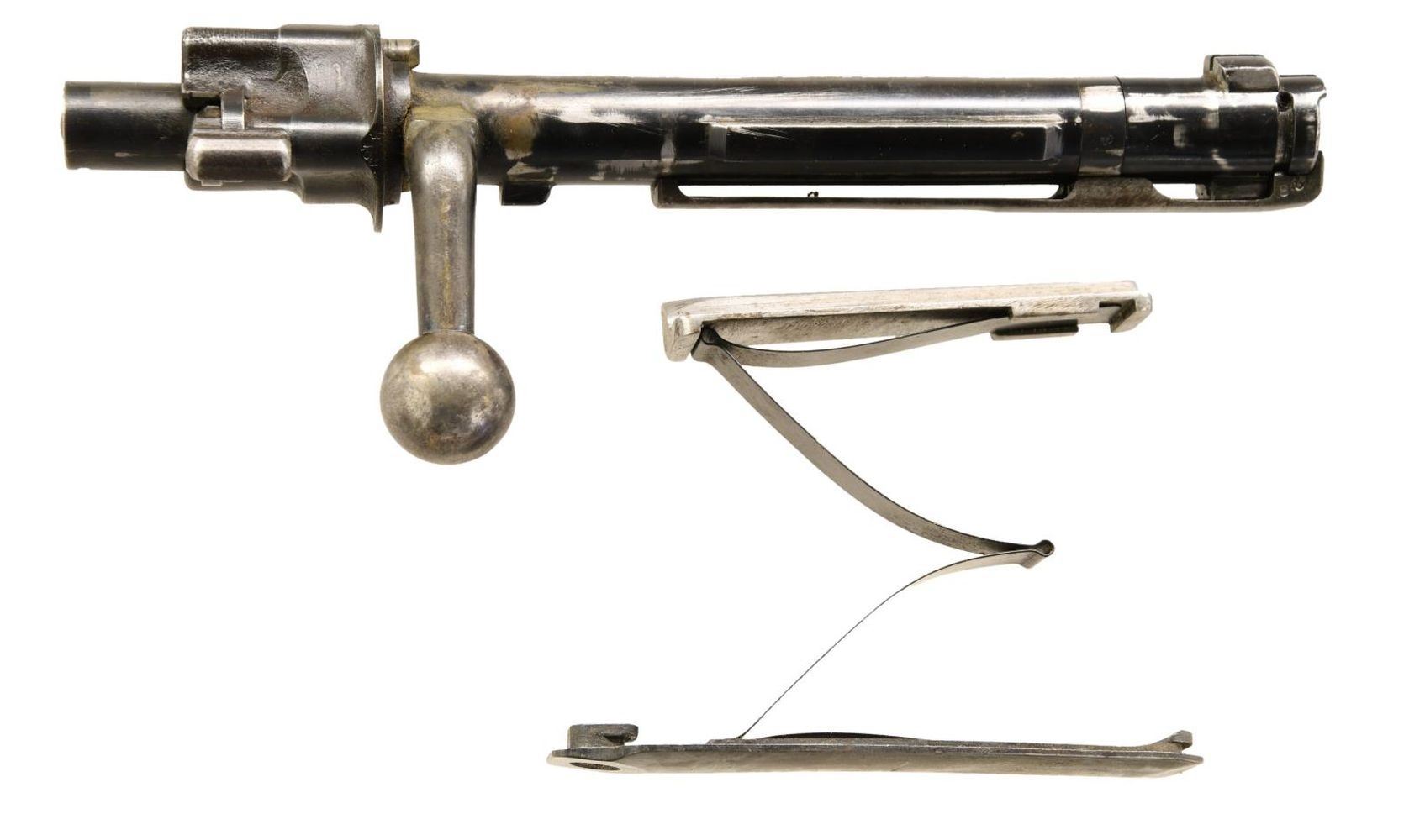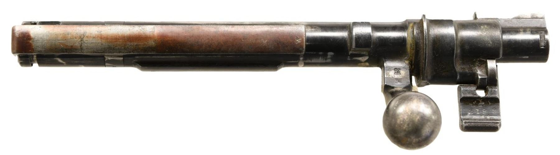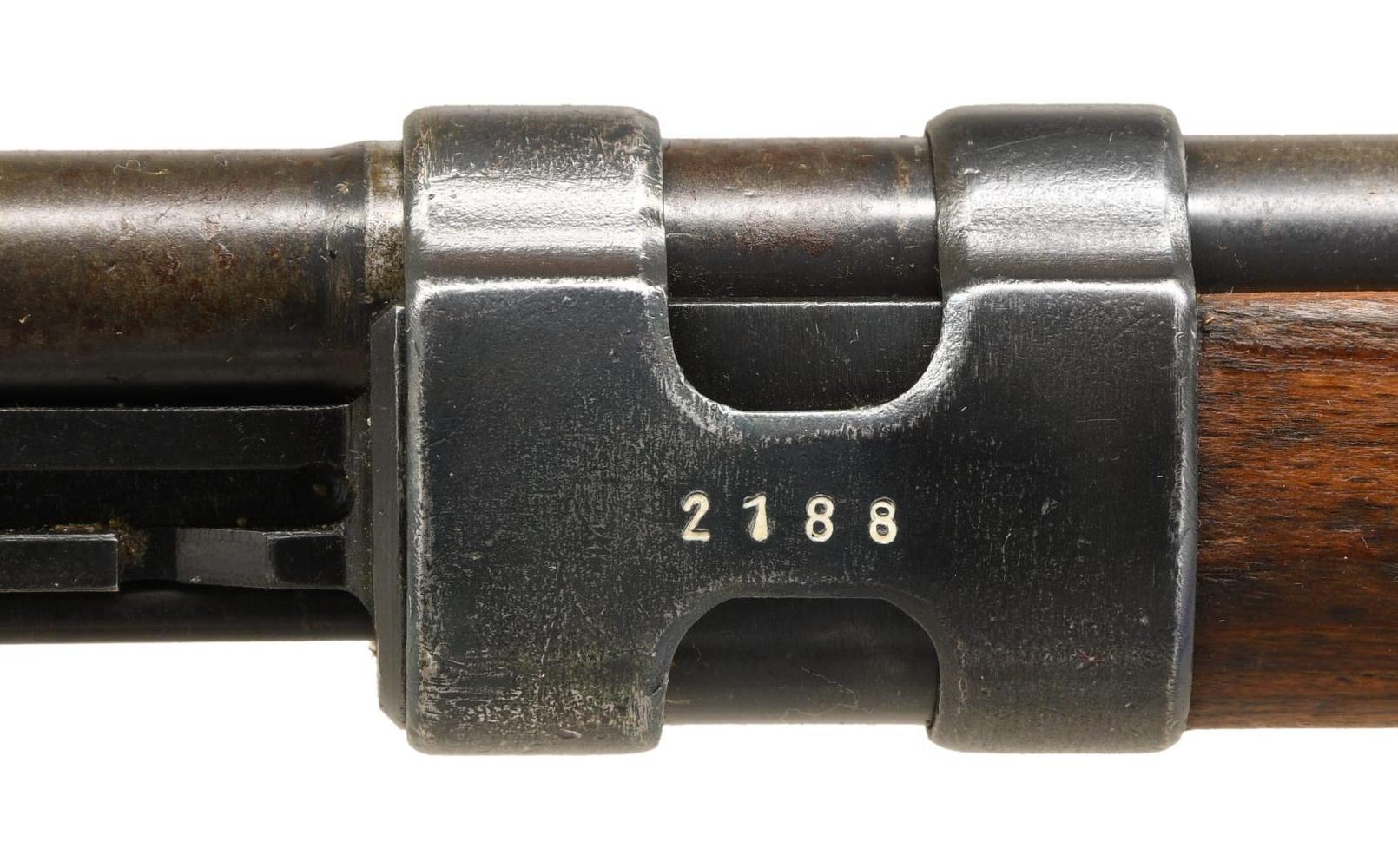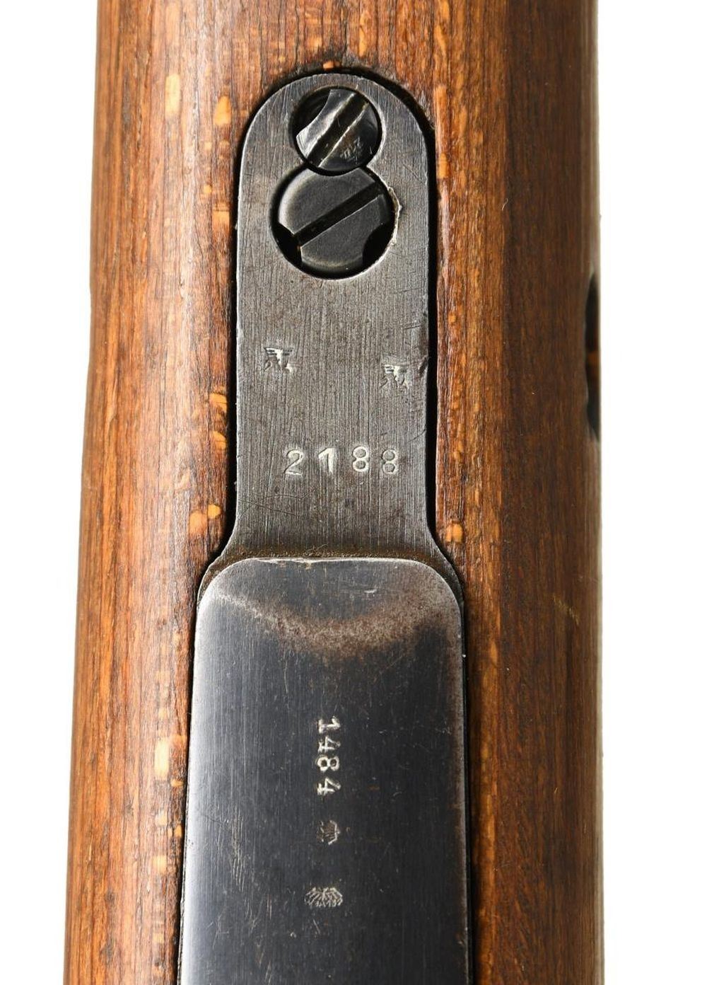 RIFLE W/ ERMA CONVERSION KIT. Cal. 8mm Mauser. S# 2188k. Bbl. 23 1/2". Blade front sight w/ hood. Tangent rear sight graduated to 2000m. Receiver top marked "duv 40" denoting 1940 Berliner Lubecker production. Right side of receiver has three eagle "214" Waffenamts. Several markings have added white highlight paint. Matching numbers on bbl., rear sight parts, bolt release, both bands & trigger guard. Handguard number appears to match w/ an overstamped "1". Bolt parts appear renumbered to match & they bear eagle "26" Waffenamts. Floorplate, action screws, buttplate, follower & buttplate are unnumbered. Blued finish. Laminated stock set w/ left side sling provisions & K98k style sling. Right side of butt has two faint Waffenamts & an eagle "M" Kriegsmarine marking. Stock has added recoil crossbolt behind bolt cutout. Cleaning rod present. This rifle is pictured on pg. 152 of Richard Law's book "Backbone of the Wehrmacht". The book states this rifle was brought back by a vet who found it w/ the 22 conversion kit matching numbered to the gun. The book further states this rifle was found at the Kriegsmarine Uboat pens in Lorient, France. MAGS: 1-5 rd. Erma 22 LR detachable. UNATTACHED ACCESSORIES: Erma EL24 conversion unit numbered "2710b" w/ matching numbers. Rear of conversion unit & right side of bolt both have added "2188" number that matches rifle. Bore of conversion unit is bright & very good. Also included are a black aftermarket hardcase, wooden case for Erma conversion unit & copies of the pgs. of Backbone of the Wehrmacht where this rifle was pictured. CONDITION: stock set appears lightly sanded w/ a couple gouges around both recoil lugs, a few small laminate cracks, a couple small chips, scattered dings & handling wear. Metal retains 40% blue w/ overall fading to gray & some oxidation. Worn pitted bore. (23-7606 & 23-7607). CURIO. $4000-6000.