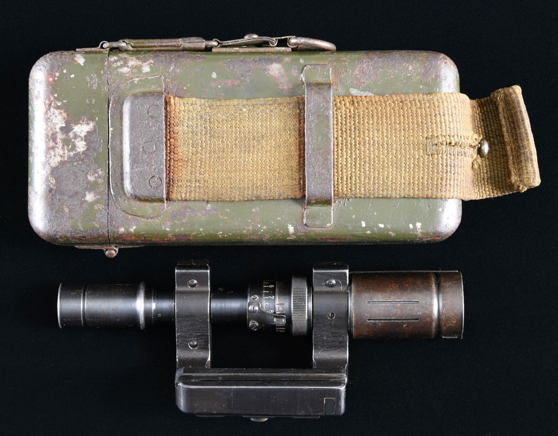 This lot consists of a WW2 German ZF-41 scope, mount & case. Scope is marked "fzg" for Feinmechanik G.m.g.H., Kassel & "ZF41/1". Scope has post-reticle & good optics. Mount is marked "duv" for Berliner Luebecker & appears renumbered "968". Case has added "EH" paint markings on bottom & "jyb" marking on lid with German inspection stamp. CONDITION: scope & mount show scattered edge wear, fading & some oxidation. Scope can shows scattered flaking green paint & oxidation. (02-23948/MJC). $1000-1500.