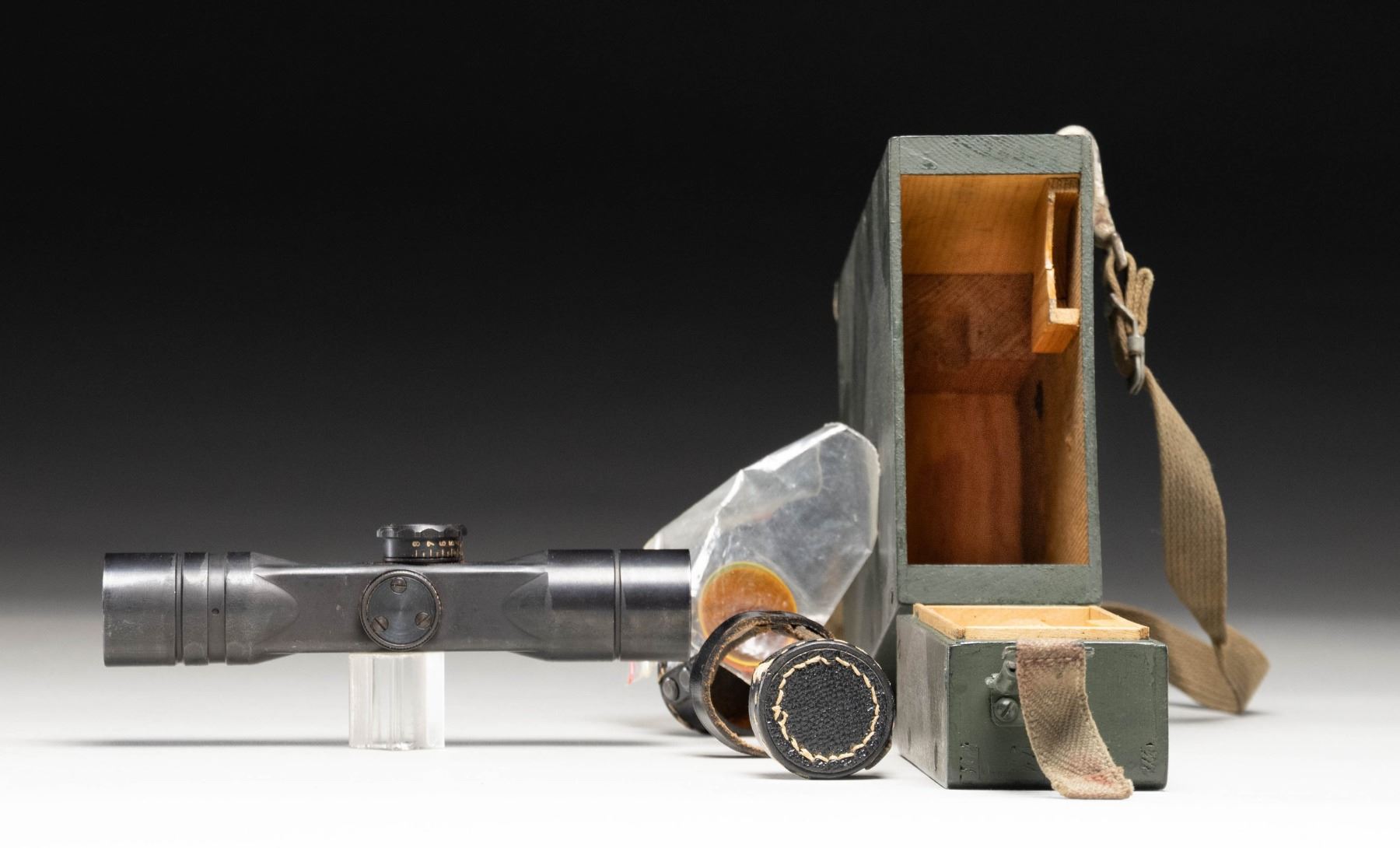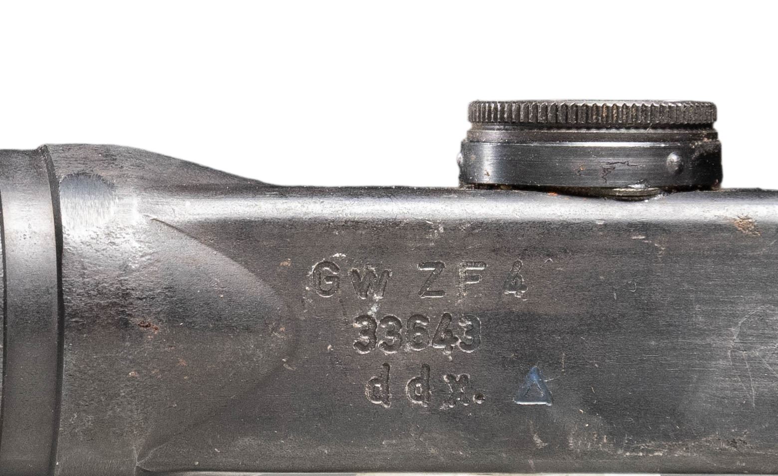 ddx coded ZF4 scope numbered "2268" with wooden carrying case numbered "2628". Case appears to be repro or perhaps a restored original with newer paint, interior & markings. Canvas strap is present on case but other straps not present. Leather scope caps included that appear to be reproduction. No mount present. CONDITION: scope case shows some light flaking & wear. Scope tube shows scattered edge wear & light oxidation. (02-25999/MJC). $600-1,000.