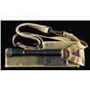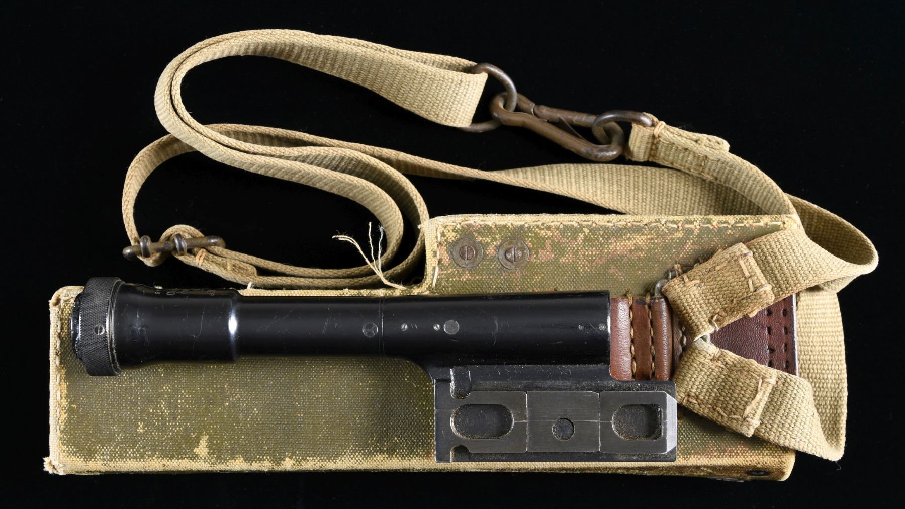 This lot consists of a 2.5x10 Toko made scope, mount & rubberized canvas carrying case. Scope is numbered "1910" & is missing its rubber eyepiece. Optics have a green tint but reticle is visible. Carrying case its missing its top lid & latch assembly but does have a carrying strap. CONDITION: carrying case shows scattered flaking & crazing. Scope & mount show scattered flaking black enamel finish. (02-23950/MJC). $1500-2000.