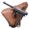 Cal. 8mm Nambu. S# 59525. Bbl. 4 3/4". Blade front sight fixed rear sight. Matching numbers on slide, trigger, bolt & cocking piece. Firing pin & extension are unnumbered. right rear of slide has serial number, Nagoya & Chuo Kogyo symbols. Right rear of frame has "14.4" Showa date for April, 1939. Blued finish with strawed small parts. Grooved Asian hardwood grips. MAGS: 2-8 rd. both mismatched & blued. UNATTACHED ACCESSORIES: rubberized canvas clamshell holster. Holster flap is tearing & coming loose. CONDITION: grips have added finish with some scattered chipping, dings & handling marks. Metal retains 50% original blue with scattered fading to gray, edge wear, oxidation, dings & some pitting. Action functions properly when hand cycled. Good bore with some light oxidation. (24-6998/MJC). CURIO. $600-900.