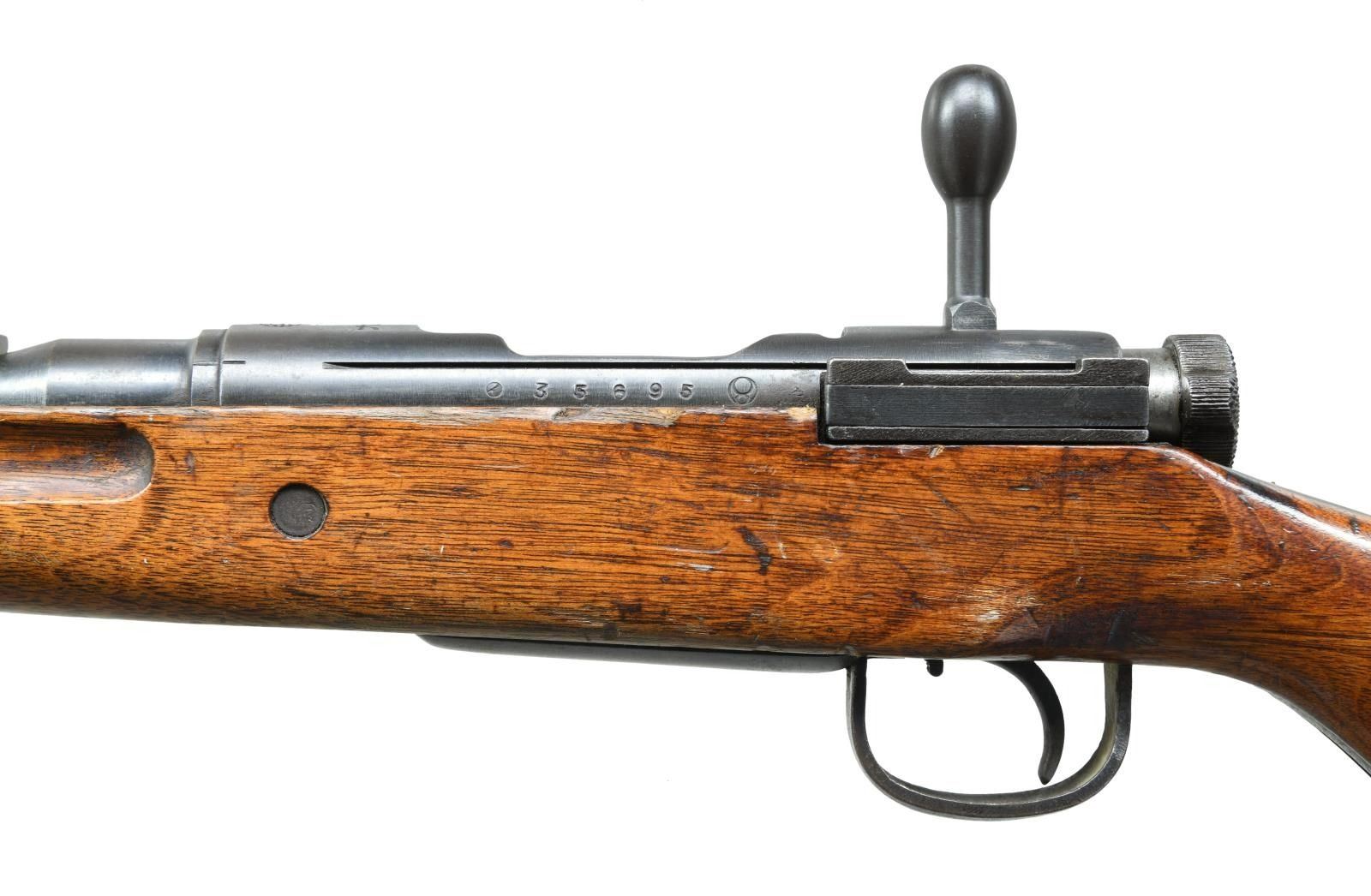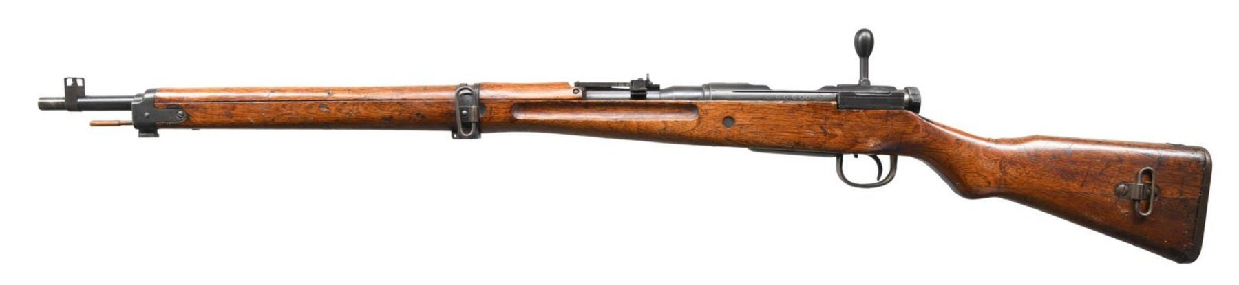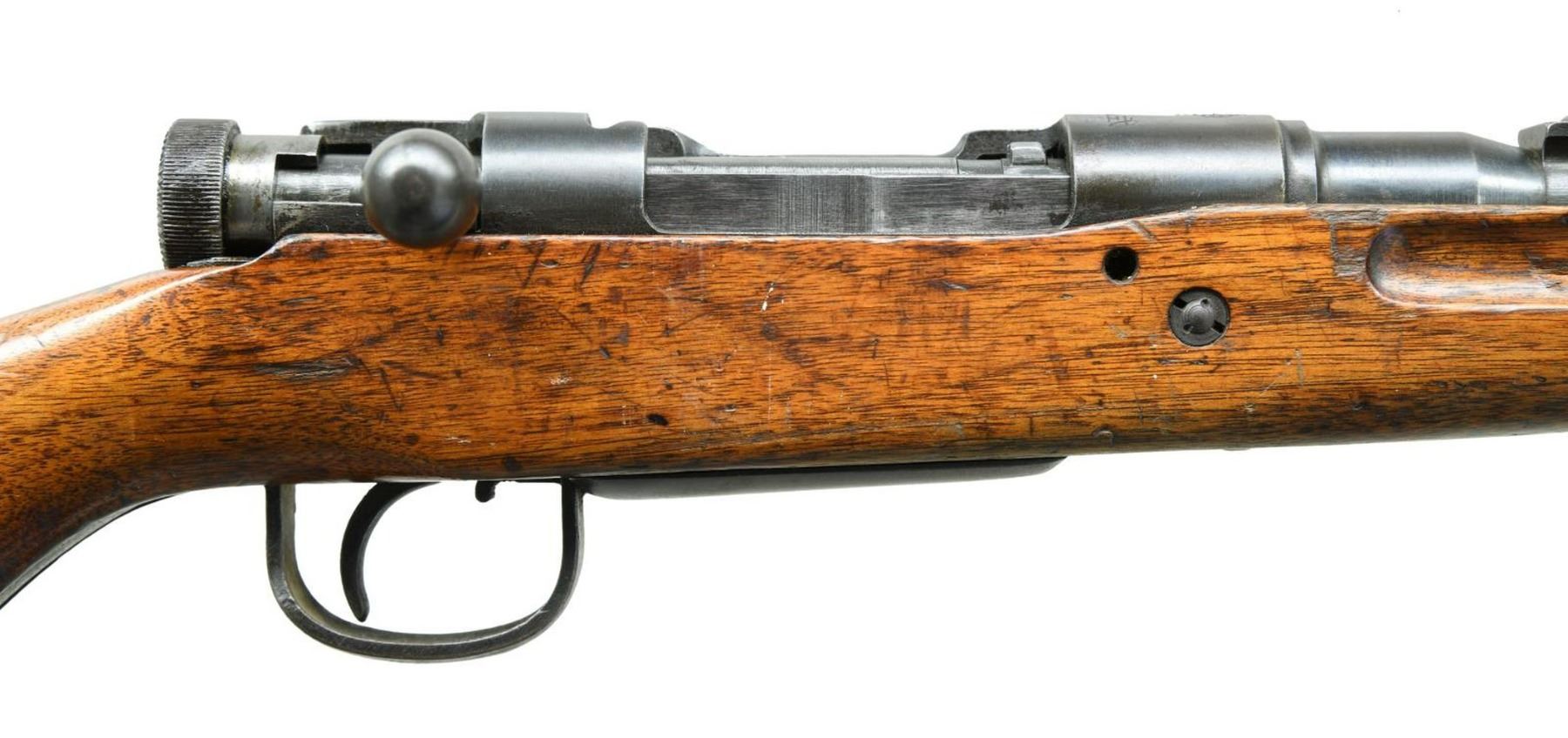 Cal. 7.7 Jap. S# 35695. Bbl. 25 ½”. Receiver top has “Type 99” markings & mum w/ several peen markings. Left side of receiver has first series marking, serial & Nagoya symbol. Matching numbers on bayonet lug, bolt & extractor. Firing pin & safety are Type 38 replacements. Rear band has provision for monopod but no monopod or dust cover present. Blade front sight w/ protective ears. Ladder rear sight graduated to 1500m w/o AA wings. Asian hardwood stock w/ two piece construction & left side sling swivels. Bottom of butt has Nagoya proofs. Replacement wooden ramrod present. CONDITION: stock set retains much Urushi finish w/ a large area of flaking on right side near rear band, some roughness on bottom of butt, a few chips, scattered dings, scratches & handling wear. Metal retains 40% original blue w/ overall fading to brown & some light oxidation. Very good bright bore. (23-2682/MJC). CURIO. $400-600.