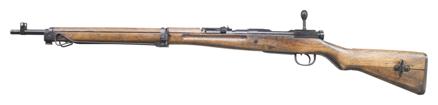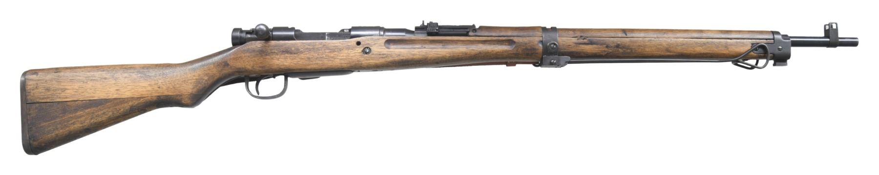 Cal. 7.7 Jap. S# 18047. Bbl. 25 7/8". Blade front sight with protective ears. Ladder aperture rear sight graduated to 1500m with AA wings. Bayonet lug is unnumbered & bolt parts are mismatched. Receiver top has ground mum with Type 99 markings. Left side of receiver has Toyo Kogyo markings, serial number & what appears to be a 32nd series marking. Blued finish. Asian hardwood stock set with two piece butt, left side sling swivels & repro sling. Monopod present. No cleaning rod present. CONDITION: sanded & oiled stock set shows some separation at the joint, scattered dings & handling marks. Metal shows a mix of original blue & touch up with scattered fading, edge wear & light oxidation. Action functions properly when hand cycled. Bright near excellent bore. (25-3821/MJC). CURIO. $300-400.