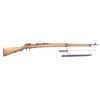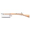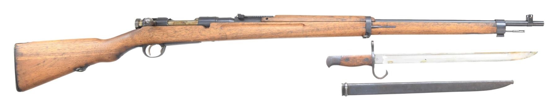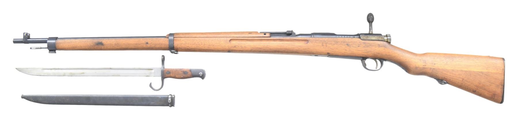 Cal. 6.5 Jap. S# 48281. Bbl. 3 1/2". Blade front sight with protective ears. Ladder rear sight graduated to 2400m. Matching numbers on receiver, bayonet lug & floorplate. Bolt parts are mismatched. Receiver top has ground mum & Type 38 markings. Left side of receiver has Nagoya & 26th series symbols with serial number. Blued finish with strawed small parts. Asian hardwood stock set with two piece butt & bottom mounted sling swivels. Replacement cleaning rod present. UNATTACHED ACCESSORIES: Kokura/Tokyo arsenal made Type 30 bayonet with scabbard. Blade is brightly finished & bayonet has hooked crossguard. CONDITION: sanded stock set shows a chip missing near buttplate tang, a small handguard crack ahead of rear sight, some dings & handling marks. Buttplate is missing lower screw causing it to be loose. Metal retains 85% blue with a touch up area around ground mum, scattered light oxidation & fading to gray. Action functions properly when hand cycled. Good bore with strong rifling. (25-3334/MJC). CURIO. $300-500.