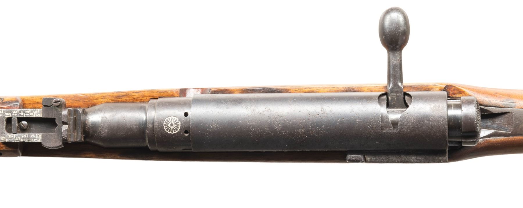 Cal. 6.5 Jap. S# 88336. Bbl. 19". Blade front sight with removed ears. Ladder rear sight graduated to 2000m. Matching numbers on receiver, bolt handle, firing pin, safety, dust cover, floorplate & bayonet lug. Receiver ring has fully intact mum & T38 markings. Left side of receiver has serial, Nagoya & 4th series symbols. Some markings have added white highlight. Blued finish. Asian hardwood stock set with two piece butt & left side sling swivels. Cleaning rod present. CONDITION: refinished stock set shows some chipping, scattered dings, handling marks & wear. Metal retains 40% blue with scattered pitting, oxidation, edge wear & areas turning gray. Action functions properly when hand cycled. Very good bore with strong rifling. PROVENANCE: Estate Collection of John "Jack" Dhooghe. (25-5548/MJC). CURIO. $400-600.