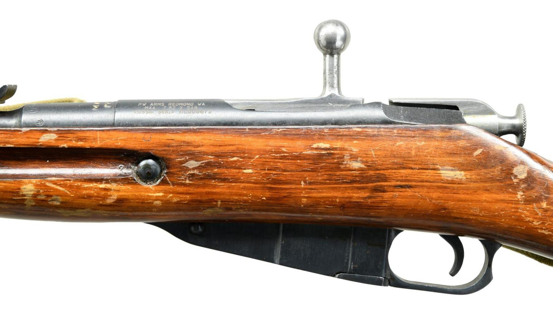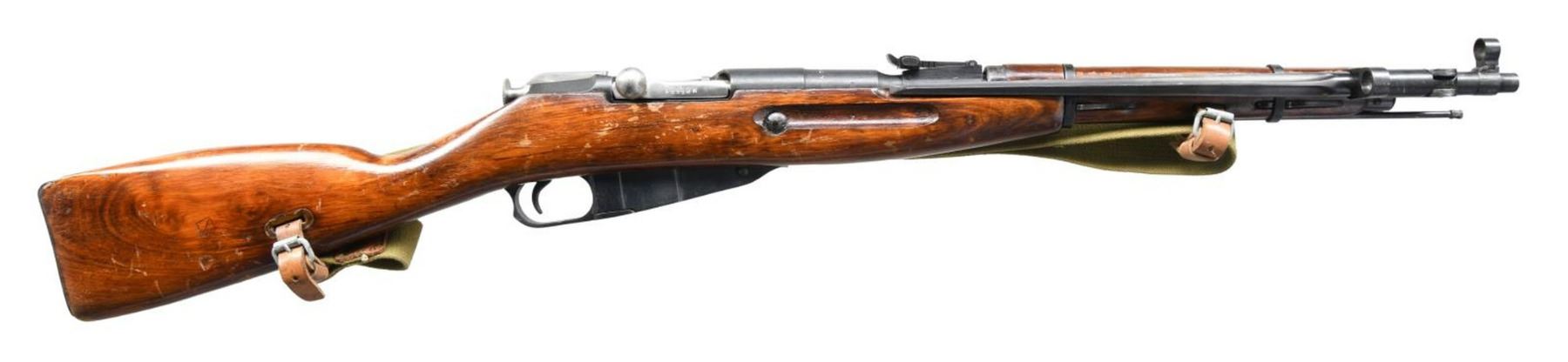 Cal. 7.62x54R. S# RC008672. Bbl. 20 ½”. Top of bbl. has 1944 date, Izhesvk & arsenal refurb markings. All matching numbers as arsenal refurbished. Left side of receiver has import marking & importer added serial number. Post front sight w/ hood. Tangent rear sight graduated to 1000m. 15” folding spike bayonet on left side of stock. Hardwood stock w/ metal sling slots & Com-Bloc style sling. Right side of stock has arsenal refurb mark. Cleaning rod present. CONDITION: stock set shows scattered flaking shellac & handling wear. Metal retains 90% arsenal rework blue w/ scattered light oxidation & some edge wear. Good bore w/ some scattered frosting but strong rifling. (23-2673/MJC). CURIO. $350-550.