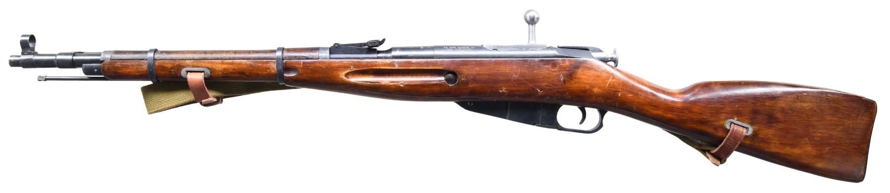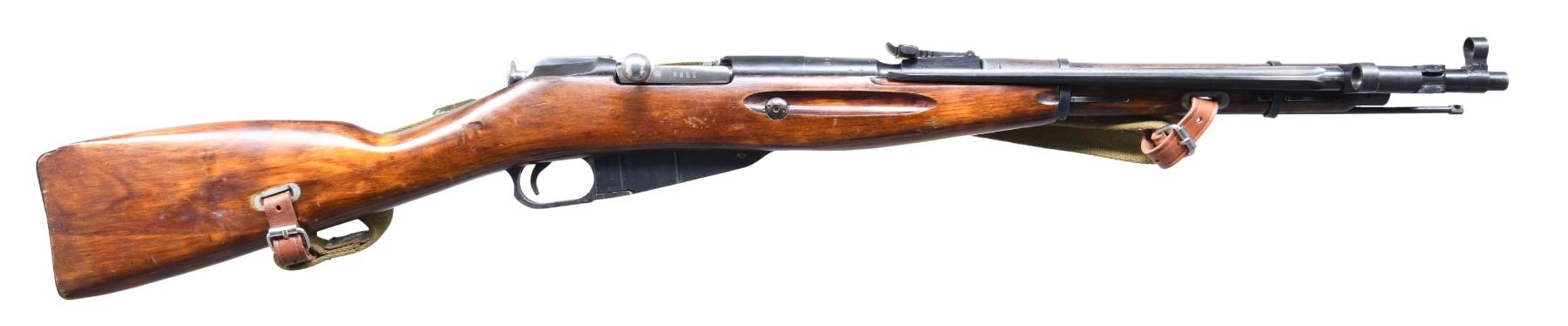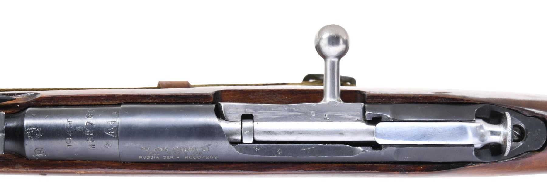 W/ FOLDING BAYONET. Cal. 7.62X45R. S# RC007269 as importer marked. Original S# HB 2789 appears on barrel, bolt, floorplate and buttplate. Round receiver. Straight bolt handle. Barrel markings include "hammer and sickle in wreath and arrow in triangle" indicating manufacture by Izhevsk arsenal. Date is 1945. Tangent rear sight graduated to 1000 meters. Post front sight w/ protective hood. 12 1/8" inch folding spike bayonet. Hardwood stock set. Buttstock has two piece construction. Green web sling with leather collars. CONDITION: stock set has flaking arsenal rework finish with numerous handling marks. Metal retains a large degree of its arsenal rework finish with light wear. Very good shiny bore w/ sharp lands. (25-996/RW). CURIO. $400-600.