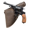 Cal. 7.62x38 R (7.62 Nagant). S# 14453. Bbl. 4 1/2". Blade front sight. Fixed rear sight. Matching numbers on left side of frame & front of cyl. Left side of frame has Tula marking, 1939 date & arsenal refurb marking. Also present on left side of frame are PW Arms import marking & importer added serial. Checkered grips. Bottom of grip frame has lanyard loop. UNATTACHED ACCESSORIES: green pebbled holster w/ cleaning rod & lanyard. CONDITION: grips show a couple light chips & some handling wear. Metal retains 92% arsenal rework blue. Fair bore w/ scattered frosting & pitting. (23-2694/MJC). CURIO. $300-450.